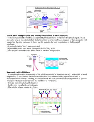 The document summarizes the key components and structure of the cell membrane according to the fluid mosaic model. It describes that the cell membrane is a lipid bilayer with embedded and associated proteins. The major constituents are phospholipids that form the bilayer, cholesterol that provides stability, and various types of membrane proteins. The fluid mosaic model and experimental evidence demonstrate that the cell membrane is fluid and dynamic in nature.