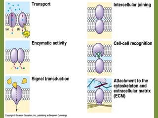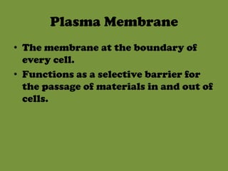 The plasma membrane functions as a selective barrier controlling what passes in and out of cells. It is composed of lipids and proteins arranged in the fluid mosaic model, where lipids form a fluid bilayer and proteins float freely within it. Materials cross the membrane through passive transport mechanisms like diffusion, osmosis, and facilitated diffusion which do not require energy, or active transport processes like carrier-mediated transport, endocytosis, and exocytosis which use cellular energy.