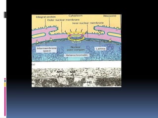 The nucleus is a membrane-bound organelle that controls all cell activity. It contains the cell's genetic material in the form of DNA and is the site of DNA replication and transcription. The nucleus is enclosed by a nuclear envelope containing nuclear pores that regulate movement of molecules between the nucleus and cytoplasm. Chromatin in the nucleus packages DNA and participates in gene expression. The nucleolus forms within the nucleus and produces ribosomes.