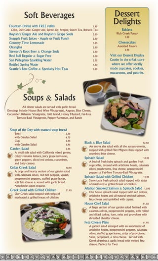 This document is a menu from Blacksburg's Original Underground Tavern that has been operating since 1963. It lists appetizers and dips including hot wings, curly fries, onion rings, mozzarella sticks, and various dips. It also lists soft beverages, soups, salads including a Greek salad and chef salad, and specialty pastas and entrees including Maryland crab ravioli. The menu provides a variety of appetizers, salads, pastas and entrees for customers.