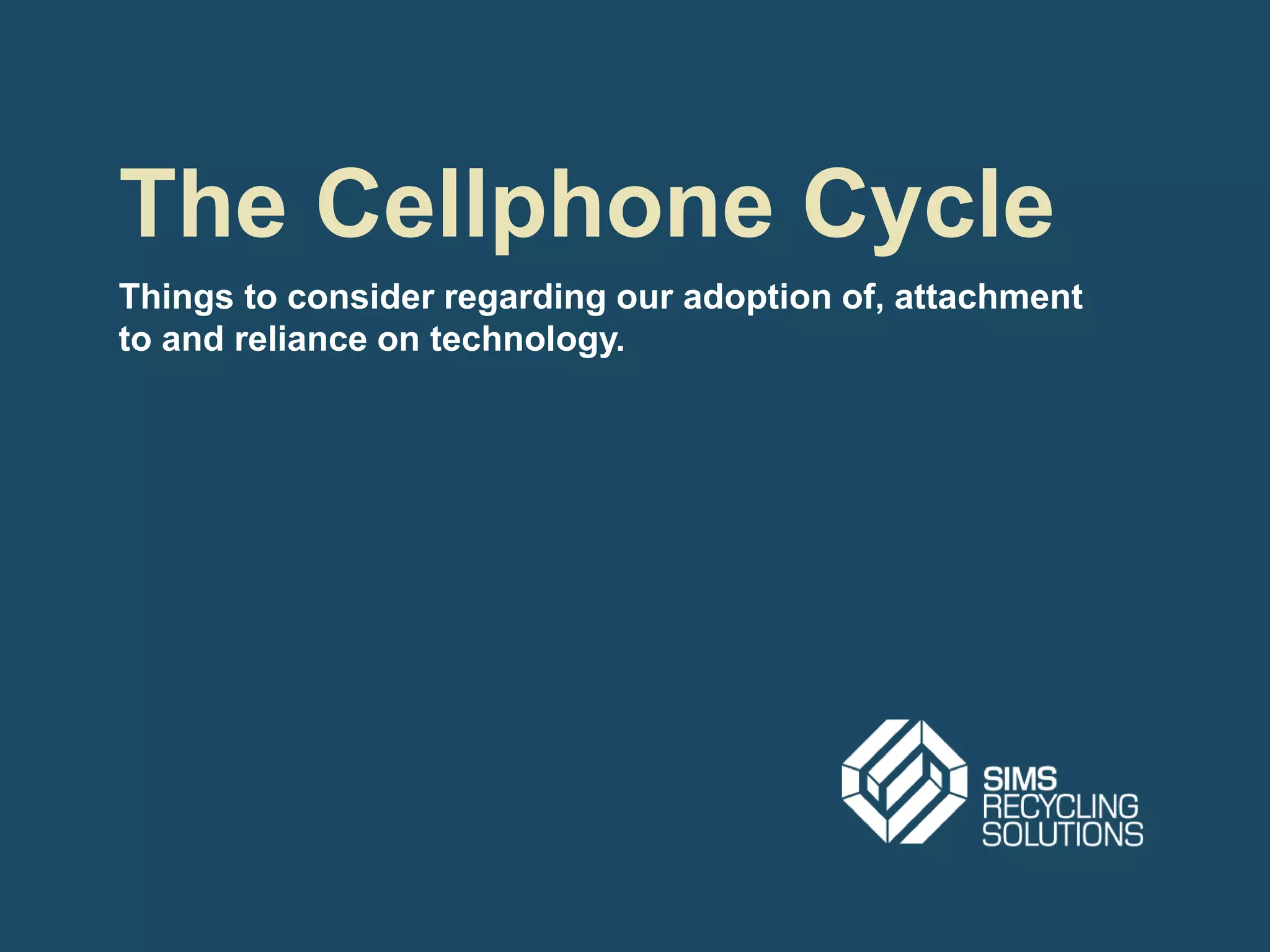 The document discusses cellphone usage and recycling in the United States. It notes that the average person owns a smartphone for 2 years and that most Americans hold onto old devices instead of recycling them, sending $60 million worth of precious metals to landfills each year. The document encourages responsible recycling through programs that recover valuable materials like copper, silver, and gold from discarded phones.