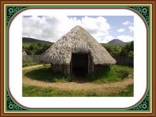 The Celts lived in Britain and Ireland during the Iron Age, settling in roundhouses made of wood, clay, and thatch. They lived in family groups within settlements and hill forts for protection. Archaeologists have discovered evidence of Celtic culture through accidental findings like a body from 2000 years ago that still had food in its stomach. The Celts were farmers, traders, and warriors trained to fight with shields, swords, spears, and chariots. They had a pagan religion with many gods and druids who performed sacrifices and divination.