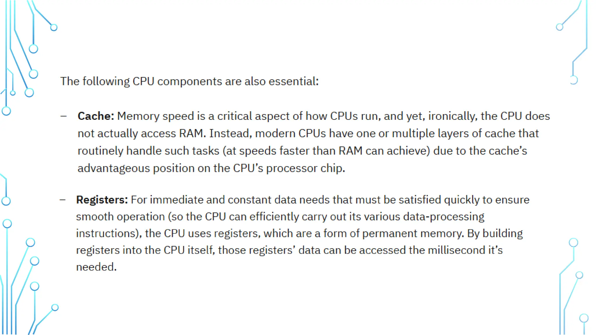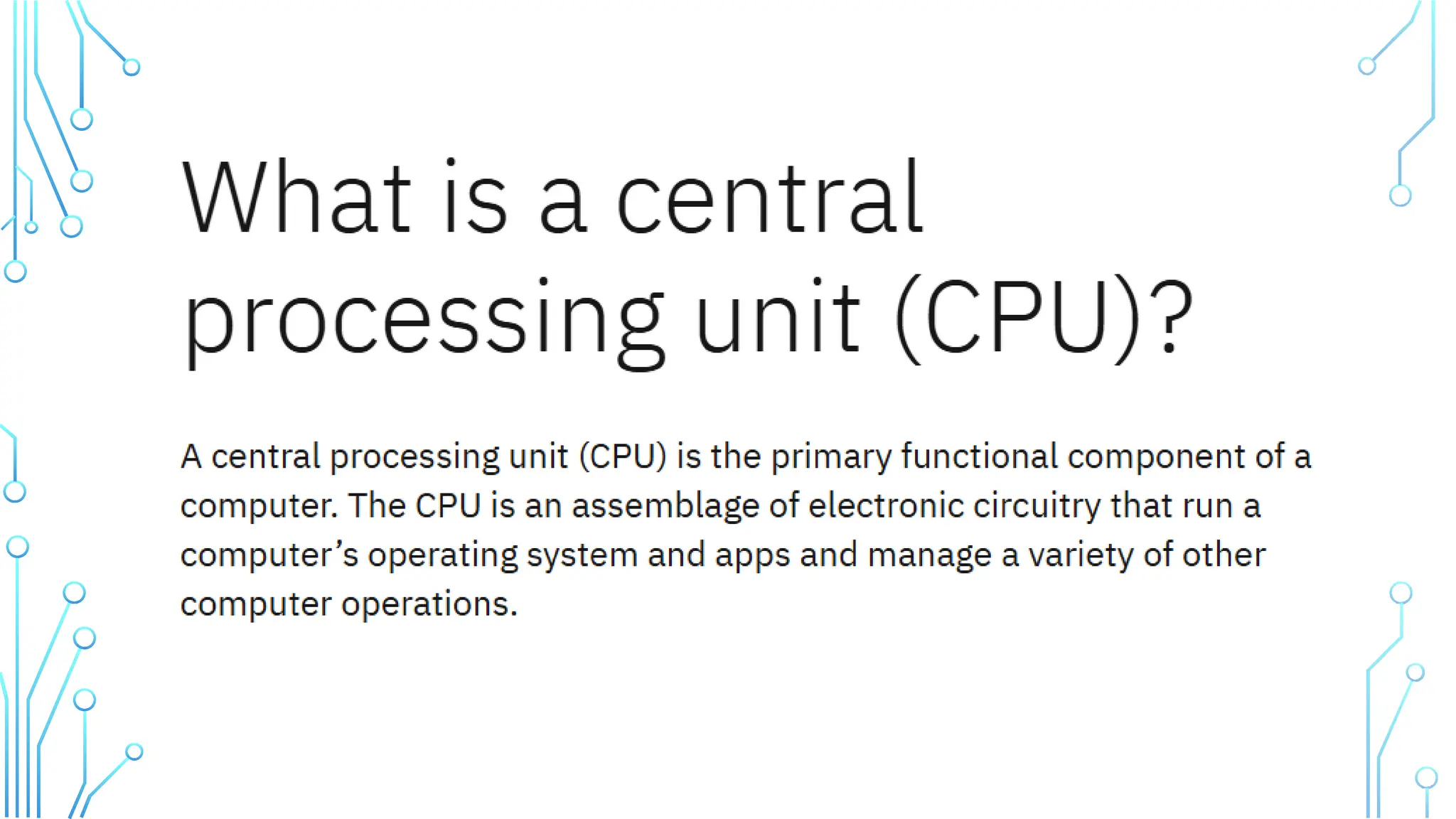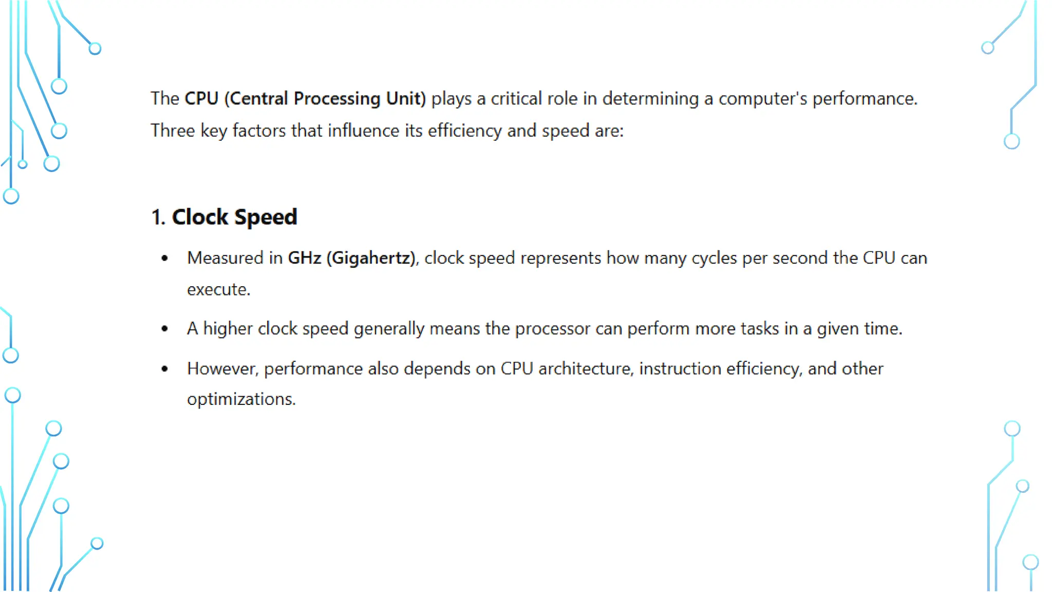 The Central Processing Unit (CPU) is the brain of the computer, responsible for executing instructions, processing data, and coordinating hardware operations. It performs calculations, logic operations, and controls data flow between memory and peripherals. The CPU consists of key components such as the Arithmetic Logic Unit (ALU), Control Unit (CU), and registers, working together to ensure efficient processing. It operates through the fetch-decode-execute cycle, interpreting and executing instructions from software programs. The CPU's speed, efficiency, and architecture directly impact a computer’s overall performance, making it a vital component in computing systems.