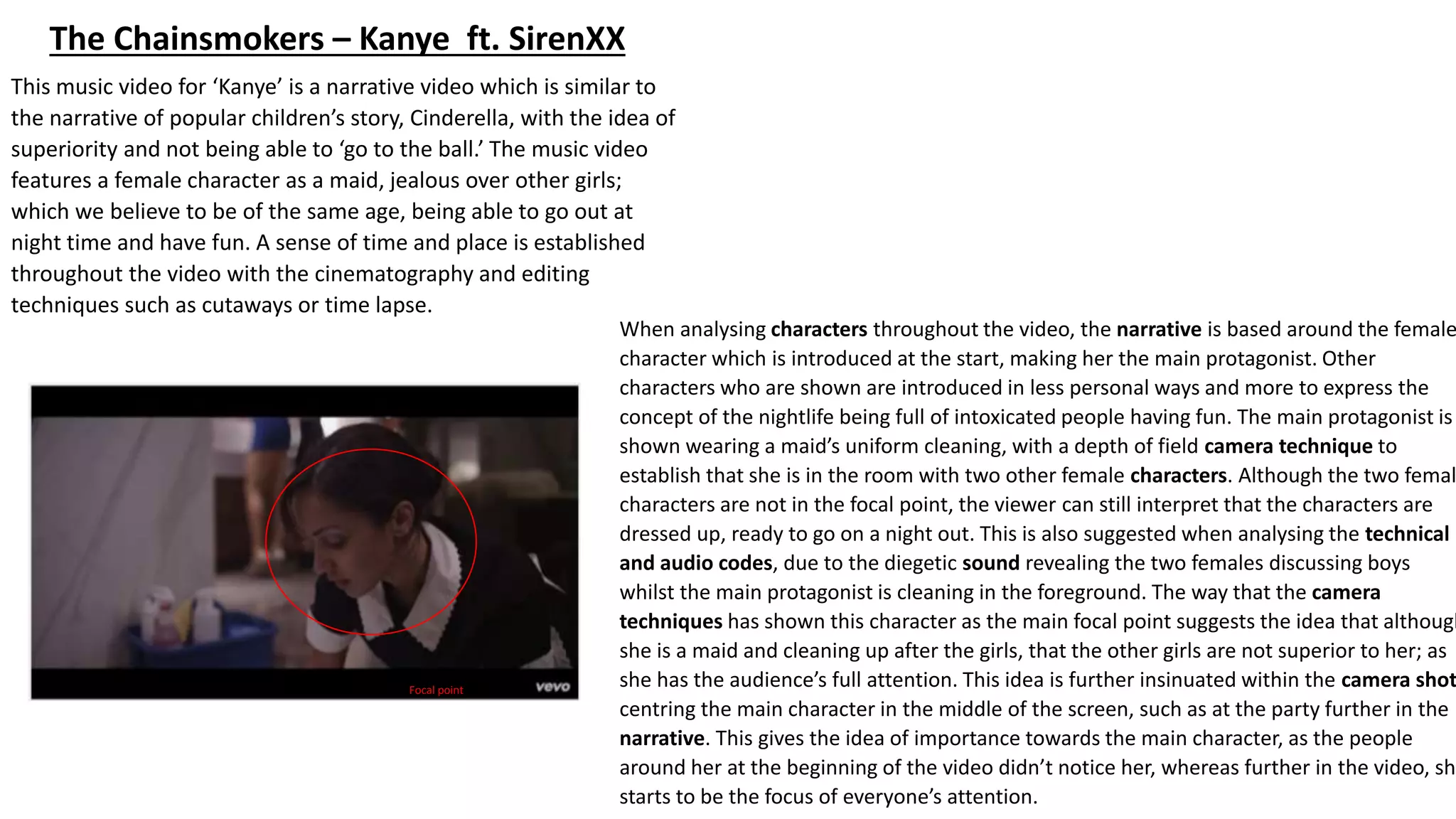 This music video tells a narrative story similar to Cinderella, following a female protagonist from maid to party guest. Technical elements like editing, camerawork, lighting, and iconography advance the story and develop characters. The video uses flashbacks and reflections to comment on themes of youth, responsibility, and social dynamics. It suggests one can balance fun and adulthood responsibilities.