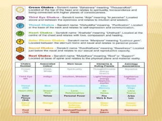 The document discusses the seven main chakras in Hindu tradition. It describes the location and significance of each chakra, including their associated colors, ruling deities, mantras, endocrine glands, senses, and elements. The root chakra is associated with basic survival instincts. The sacral chakra concerns reproduction and creativity. The solar plexus chakra relates to personal power and identity. The heart chakra governs love, compassion, and generosity. The throat chakra controls emotions and promotes creativity. The brow chakra is the seat of intelligence and individual consciousness. The crown chakra is where individual consciousness merges with cosmic intelligence.