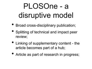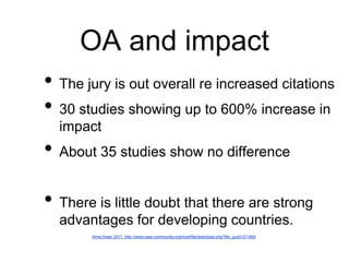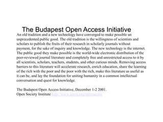 The document discusses the evolution of scholarly journals from the 17th century to the present, highlighting the transition from society journals to a commercialized journal industry that now faces a 'journals crisis' due to monopolization and rising costs. It emphasizes the emergence of open access publishing as a significant movement enabled by digital technology, aiming to provide unrestricted access to research and promote knowledge sharing. The growth of open access journals, particularly in developing countries, is noted, as well as the impact these models may have on citation rates and academic collaboration.