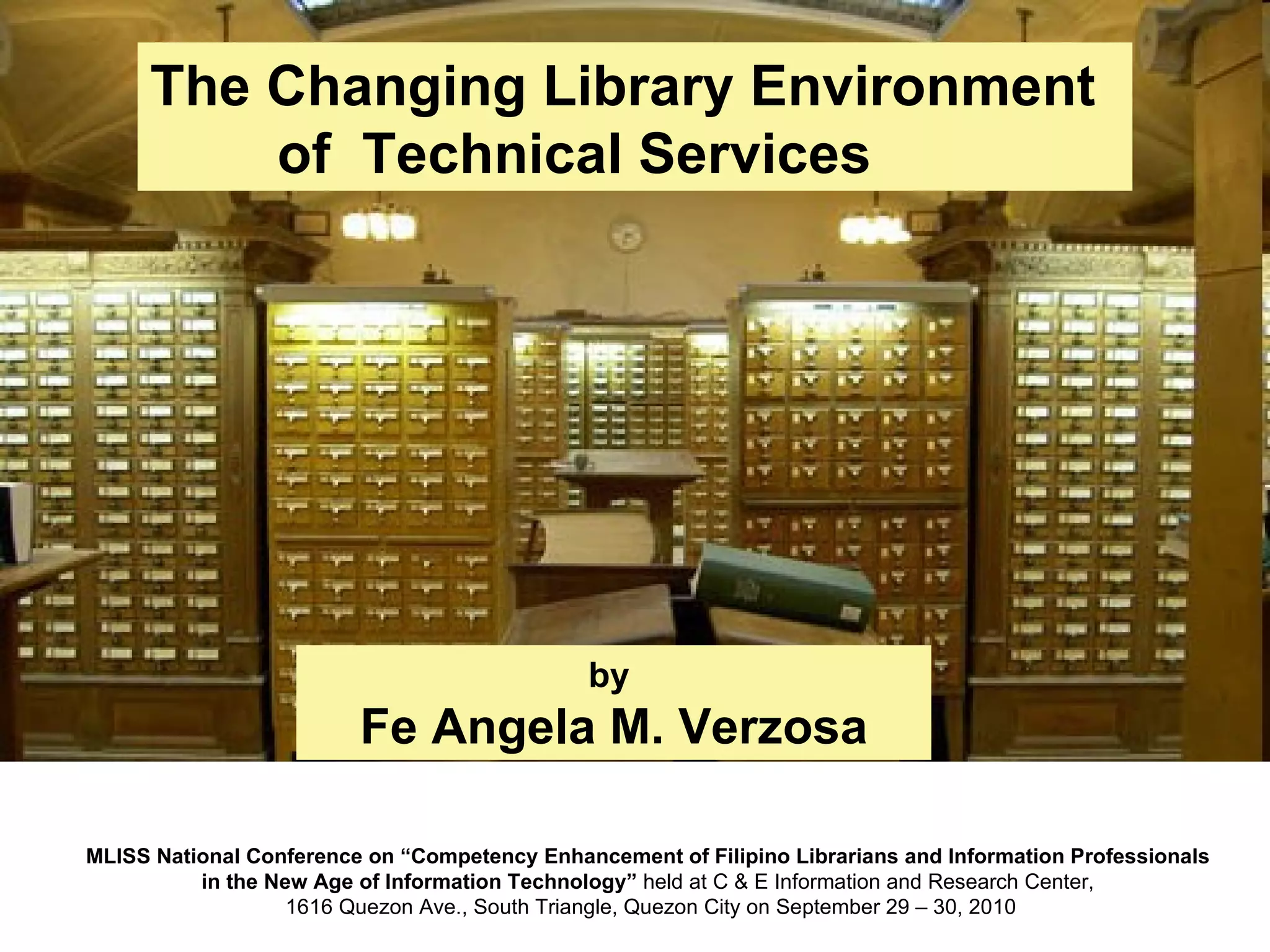 The document discusses the changing environment of technical services in libraries. It notes the increasing digitization of collections and resources, as well as the impact of library automation and Library 2.0 initiatives that support social learning. This has resulted in challenges and opportunities for technical services, including developing digital preservation expertise, providing digital archives, and training staff. Collaborating across libraries can help optimize resources and save money through activities like consortial acquisitions and shared cataloging, databases, and repositories.