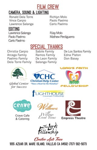 The document provides details about a play called "Changing Seasons" produced by The Lord's Fellowship Creative Arts team. It lists the director, producer, cast members and film crew for the production. It also notes that 30% of proceeds will go to Philippine Typhoon Relief and provides contact information for updates. The play was performed on December 22, 2013 at the Empress Theatre in Vallejo, CA.