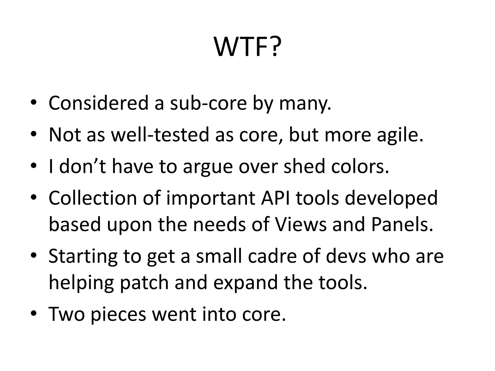 The Chaos Tools Suite provides a collection of API tools for building forms, handling AJAX interactions, and managing CSS in Drupal. It includes form wizards to create multi-step forms, an AJAX framework using a macro language to handle returned data, modals that build on the AJAX system, and tools for collapsible DIVs and sanitizing CSS. While not part of Drupal core, it is considered sub-core and provides important utilities used by modules like Views and Panels.