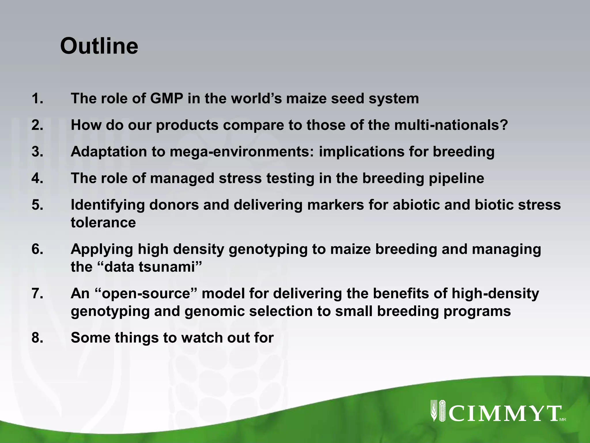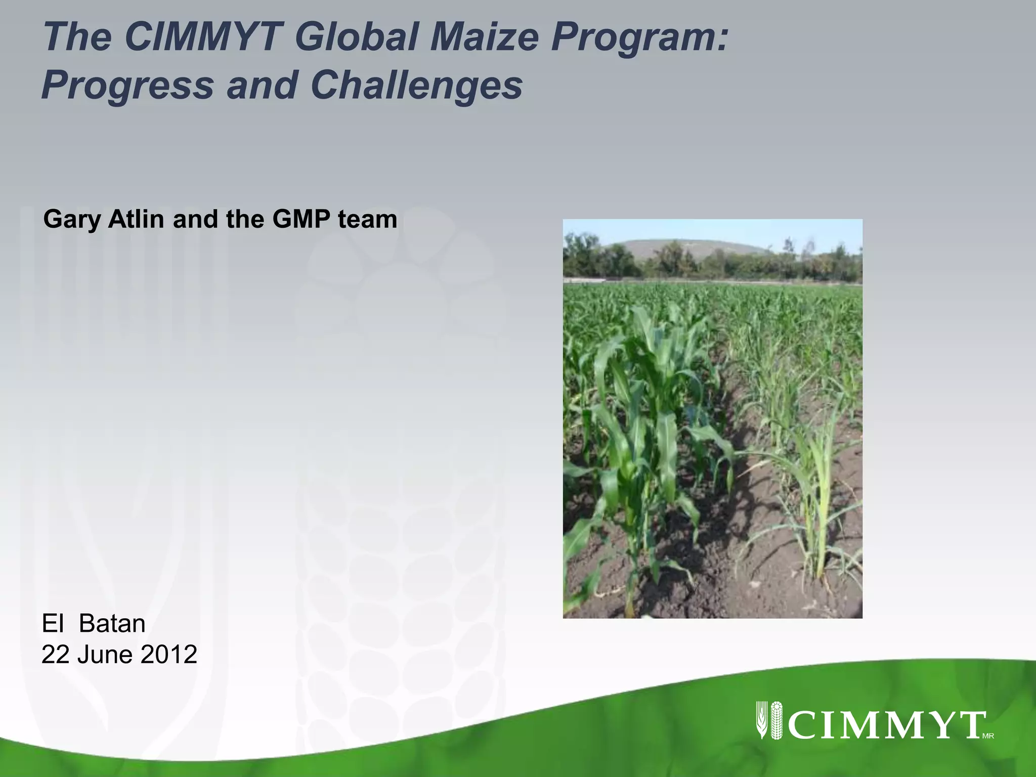 The document discusses the CIMMYT Global Maize Program's role in the world's maize seed system and their products' performance relative to multinational companies. It finds that while CIMMYT products compete well in Latin America, in Eastern and Southern Africa they perform better in low-yield, short-season locations and are equivalent or better in high-yield areas. It also examines the implications of large mega-environments for maize breeding, finding little local adaptation beyond diseases, rainfall, and elevation.