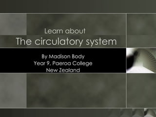 The circulatory system circulates blood through the heart and blood vessels to supply nutrients and oxygen to the entire body. The heart pumps blood an average of 60-70 times per minute to circulate the three main types of blood cells: red blood cells, white blood cells, and platelets. Red blood cells carry oxygen, white blood cells fight infection, and platelets help the blood to clot. Coronary artery disease occurs when the arteries become clogged over time, limiting blood flow to the heart, and can cause symptoms like chest pain and shortness of breath. Prevention involves lifestyle changes like a healthy diet, exercise, and stress reduction, and may also require medication.