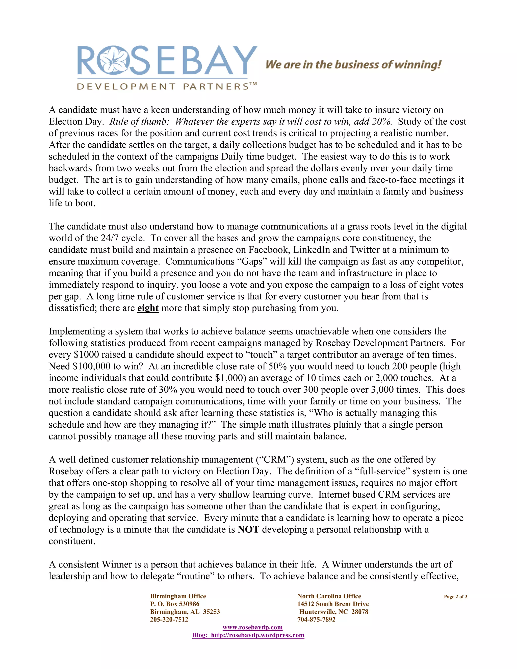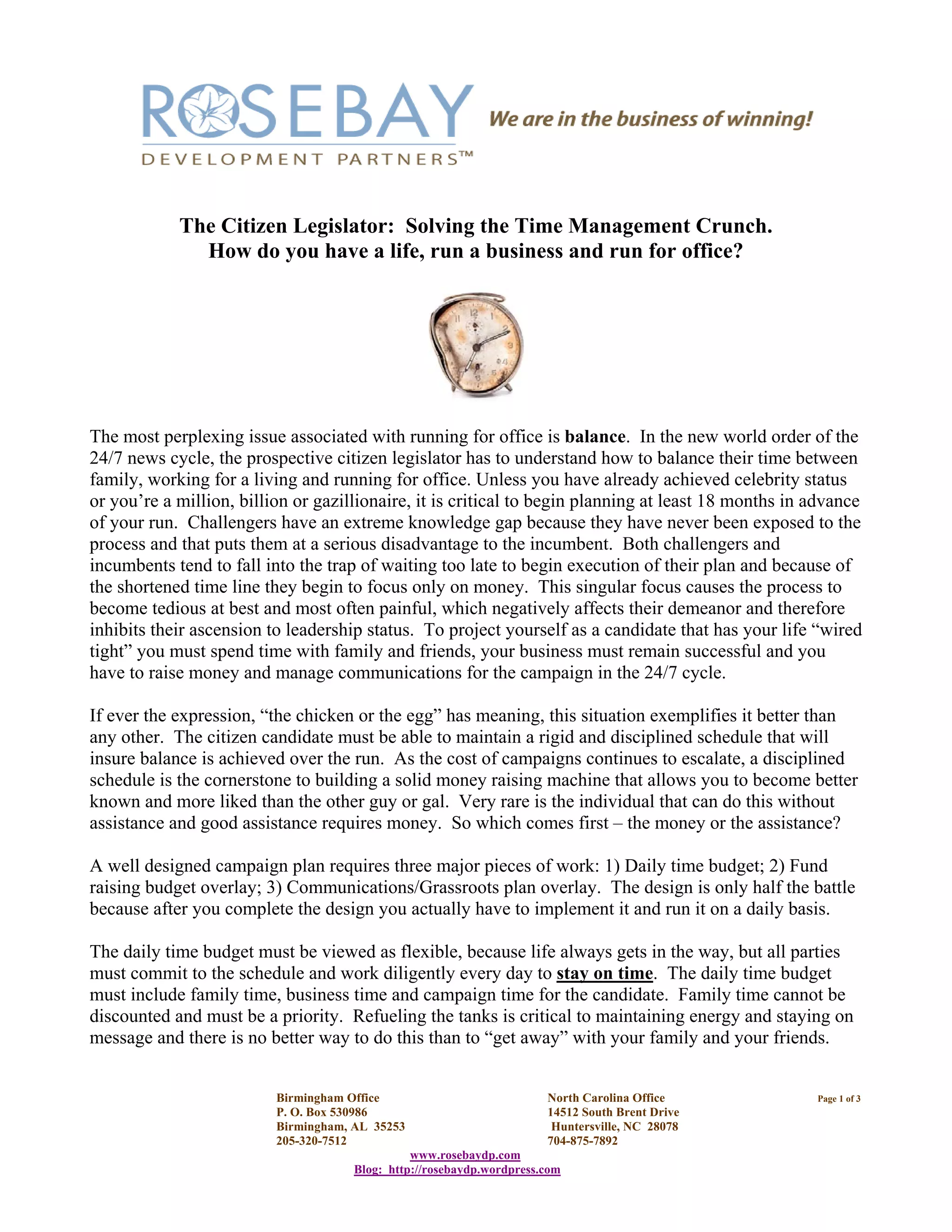 The document discusses the challenges of balancing personal, business, and campaign responsibilities for political candidates. It emphasizes the importance of advanced planning, having a well-designed daily schedule that allocates time for family, work, fundraising, and communications. It also stresses delegating tasks like managing digital media and donor relationships to a dedicated campaign team in order to achieve balance and maximize fundraising efforts.