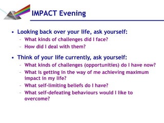 The document discusses using the Johari window model as a framework to gain self-awareness. It prompts the reader to reflect on challenges they currently face, limitations in achieving their potential, and behaviors they want to change. It describes Full Spectrum Leadership training programs that could help with personal growth and breakthroughs, including a basic weekend course and intensive 5-day residential program. The goal is for readers to consider how they can maximize their impact and what may be holding them back from their hidden potential.