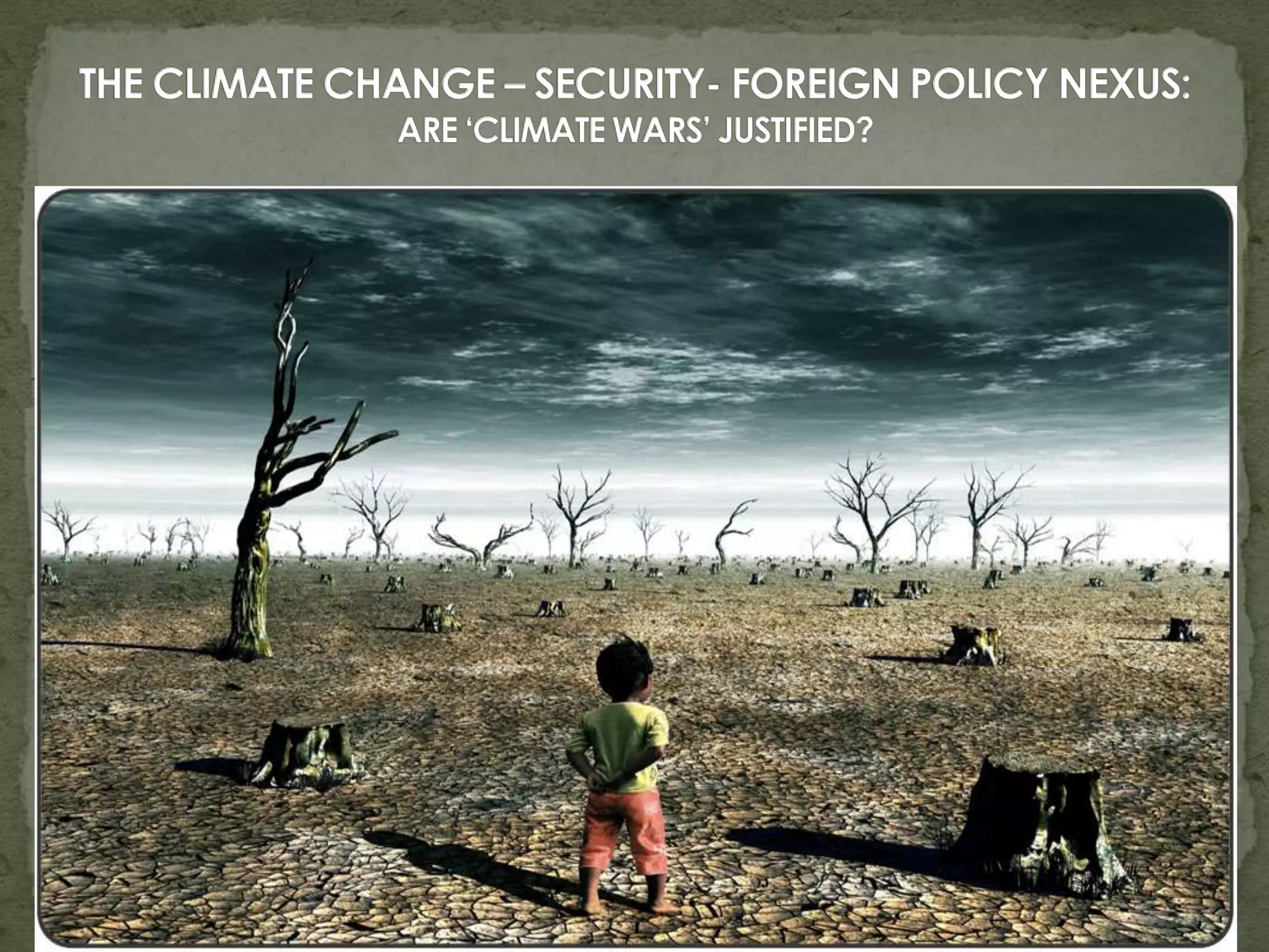 This document discusses the relationship between climate change and international security. It examines four aspects of security that may be impacted by climate change: human security, national security, international security, and ecological security. It explores predictions about impacts of climate change like rising sea levels and temperatures. It also analyzes how climate change may fuel conflicts over issues like water and displace large numbers of climate refugees. However, the document concludes that assumptions about "climate wars" are overstated and not supported by reality. International cooperation and complementary legal protections can help manage issues like water disputes and displacement of climate refugees.
