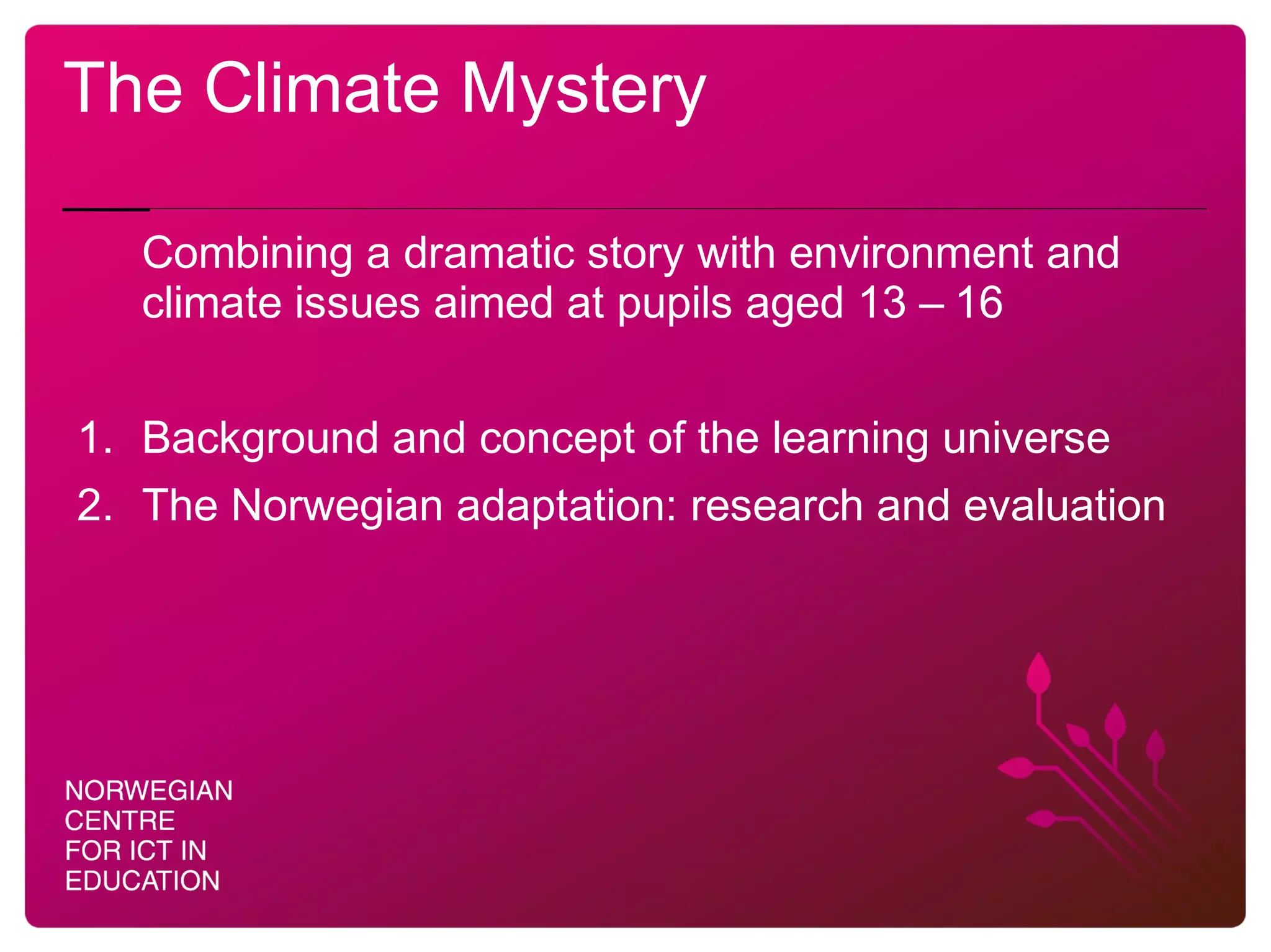 The document discusses the Climate Mystery project, an online learning universe for students aged 13-16 that combines environmental themes with interactive storytelling through video clips, games, and assignments. It highlights the Norwegian adaptation's objectives, research, and evaluation showing student engagement and teacher motivation, despite some technical and narrative challenges. Ultimately, the project indicates the potential of alternate reality games in education, emphasizing the need for strong narratives and meaningful connections between gaming and learning.