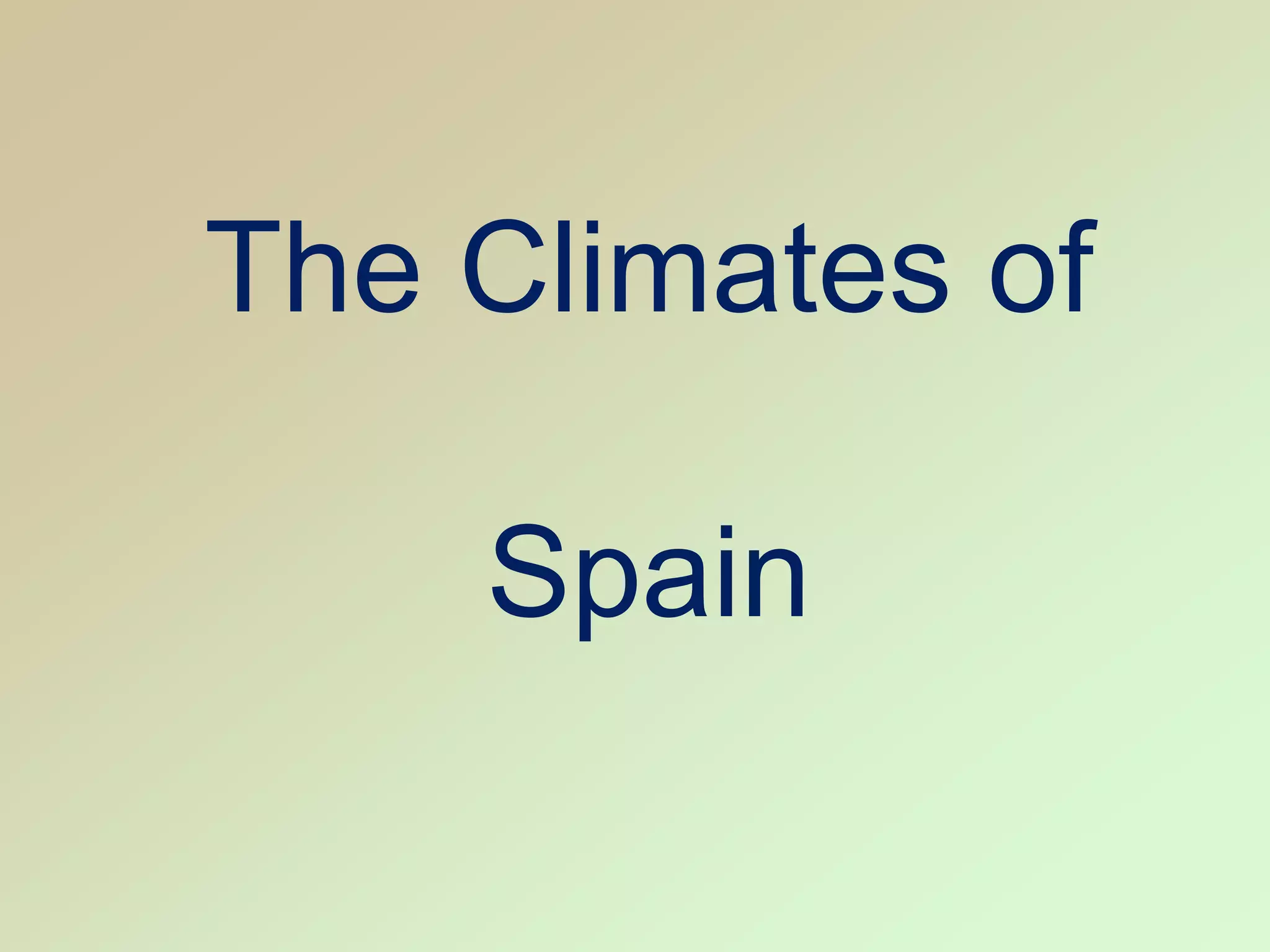 The document describes the various climates found in Spain, including the Mediterranean climate along the southern and eastern coast with hot summers and mild winters and little rainfall; the Mediterranean continental climate inland with greater temperature ranges and very little rain; the oceanic climate in northern areas with abundant rainfall year-round and milder temperatures; and the subtropical climate of the Canary Islands with warm temperatures year-round and varying precipitation depending on elevation. It also briefly mentions mountain, desert, and semi-desert climates found in other parts of Spain.