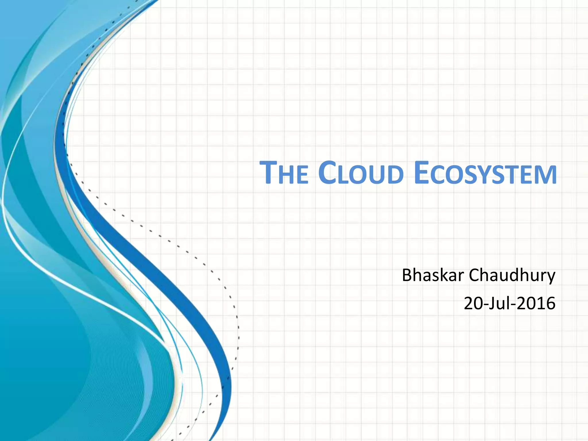 The document discusses the cloud ecosystem, including concepts of cloud computing, technologies like virtualization and service-oriented architecture, security considerations, challenges around data protection and management capabilities, and benefits such as reduced costs and increased flexibility. Cloud computing provides on-demand access to shared computing resources over a network in various service models like SaaS, PaaS and IaaS. While cloud offers benefits, challenges remain around data security, availability and regulatory compliance.
