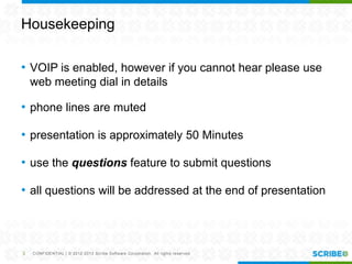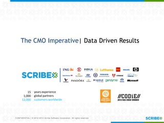 Scribe Software presented on achieving integrated marketing automation through a data-driven approach. They discussed the changing landscape where data and marketing automation are increasingly important. Scribe outlined strategies for data-driven marketing like defining use cases and logical data mappings. An example was provided of capturing large customer orders from an ERP system and adding them as subscribers in a marketing automation platform. Scribe believes starting with low hanging fruit and building experience is key to success. Questions were taken at the end.