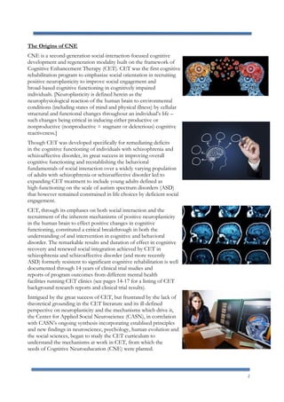 This document introduces Cognitive Neuroeducation (CNE), an innovative approach for preventing and treating cognitive and behavioral disorders. CNE was developed from Cognitive Enhancement Therapy (CET) through rigorous neuroscientific research. CNE applies principles of brain plasticity, socialization, and learning within an enriched social environment to both strengthen cognitive resources and build neuroprotective resilience against cognitive decline. The key mechanisms of CNE involve social interaction stimulating neuroplasticity changes via long-term potentiation and depression of neuronal connections.