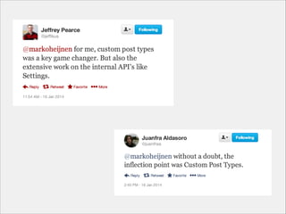 This document summarizes the code history of WordPress from its founding in 2003 to the present. It discusses major releases, contributors, added features like post meta and plugins, tools used for development like Git and unit testing, and the future direction of new APIs. The timeline shows steady growth from a few early contributors to over 200 today, with major releases every 6-12 months adding significant new functionality that maintains backwards compatibility.