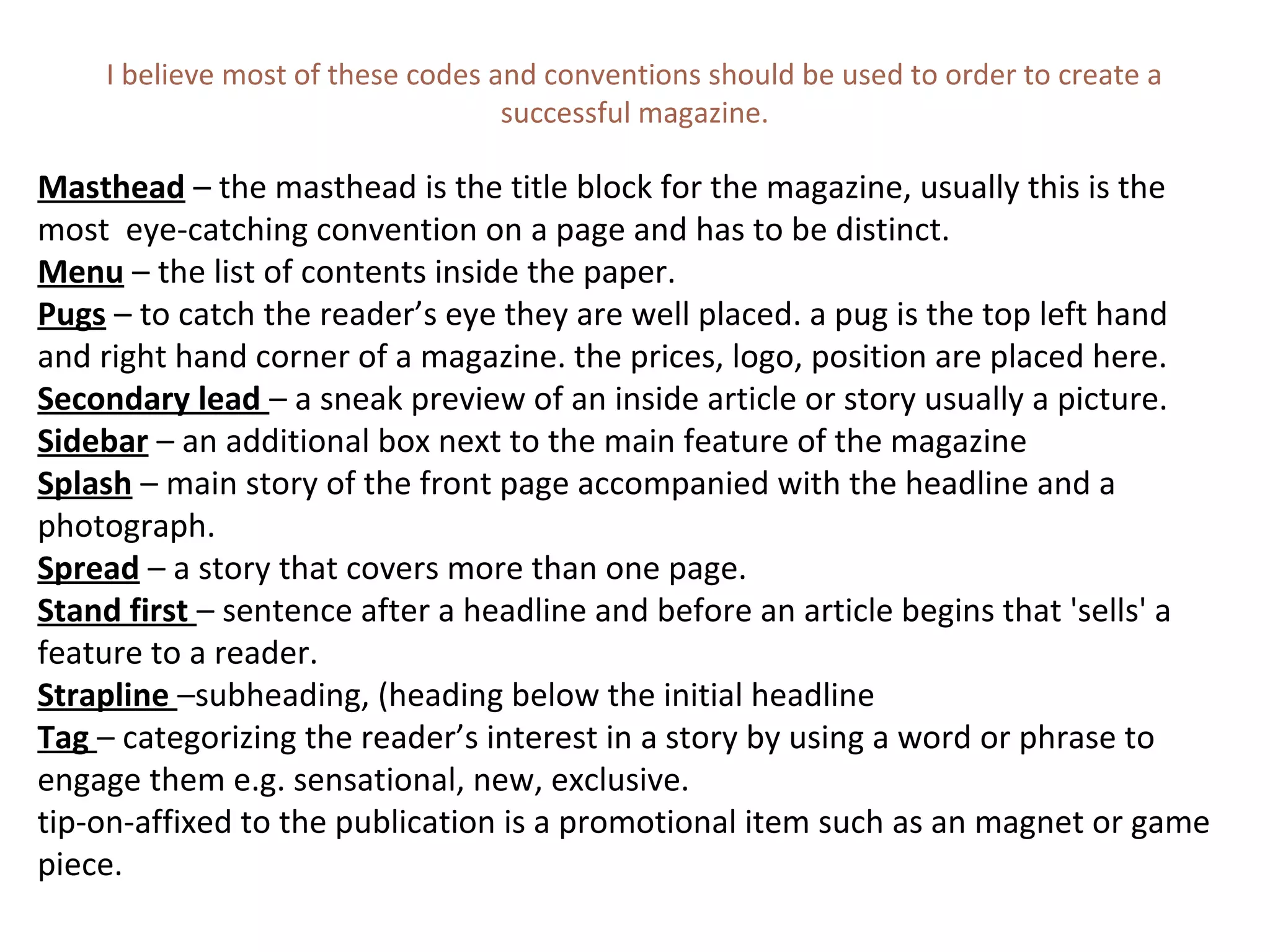 The document defines various codes and conventions used in magazines and newspapers, including: