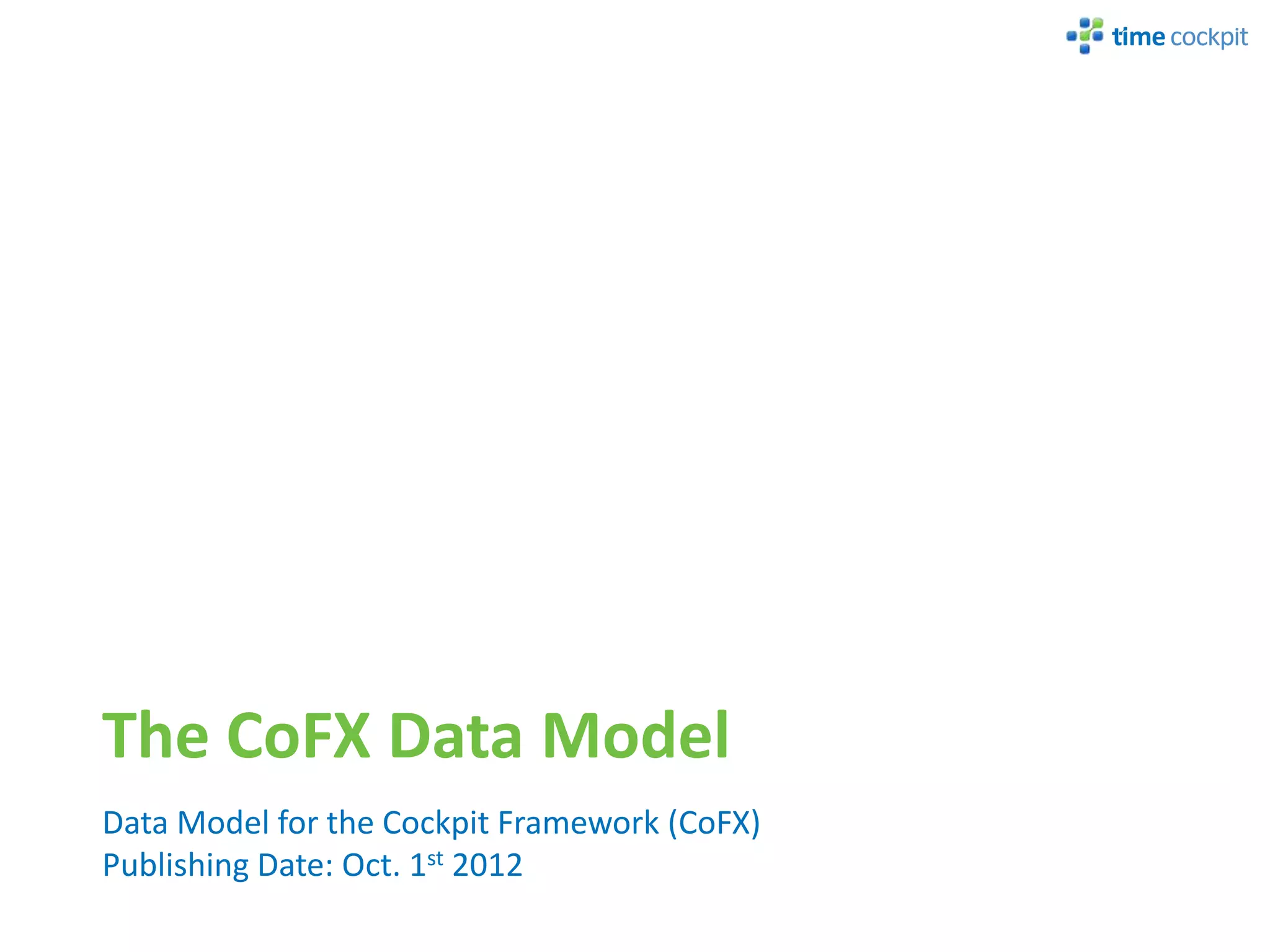 The document describes the CoFX data model, which is the data model for the Cockpit Framework (CoFX). It provides an overview of the key elements of the model including entities, properties, relations, validation rules, permissions, actions, entity views, sets, and triggers. The model uses a TCQL expression language to define things like calculated properties, validation rules, and permissions.