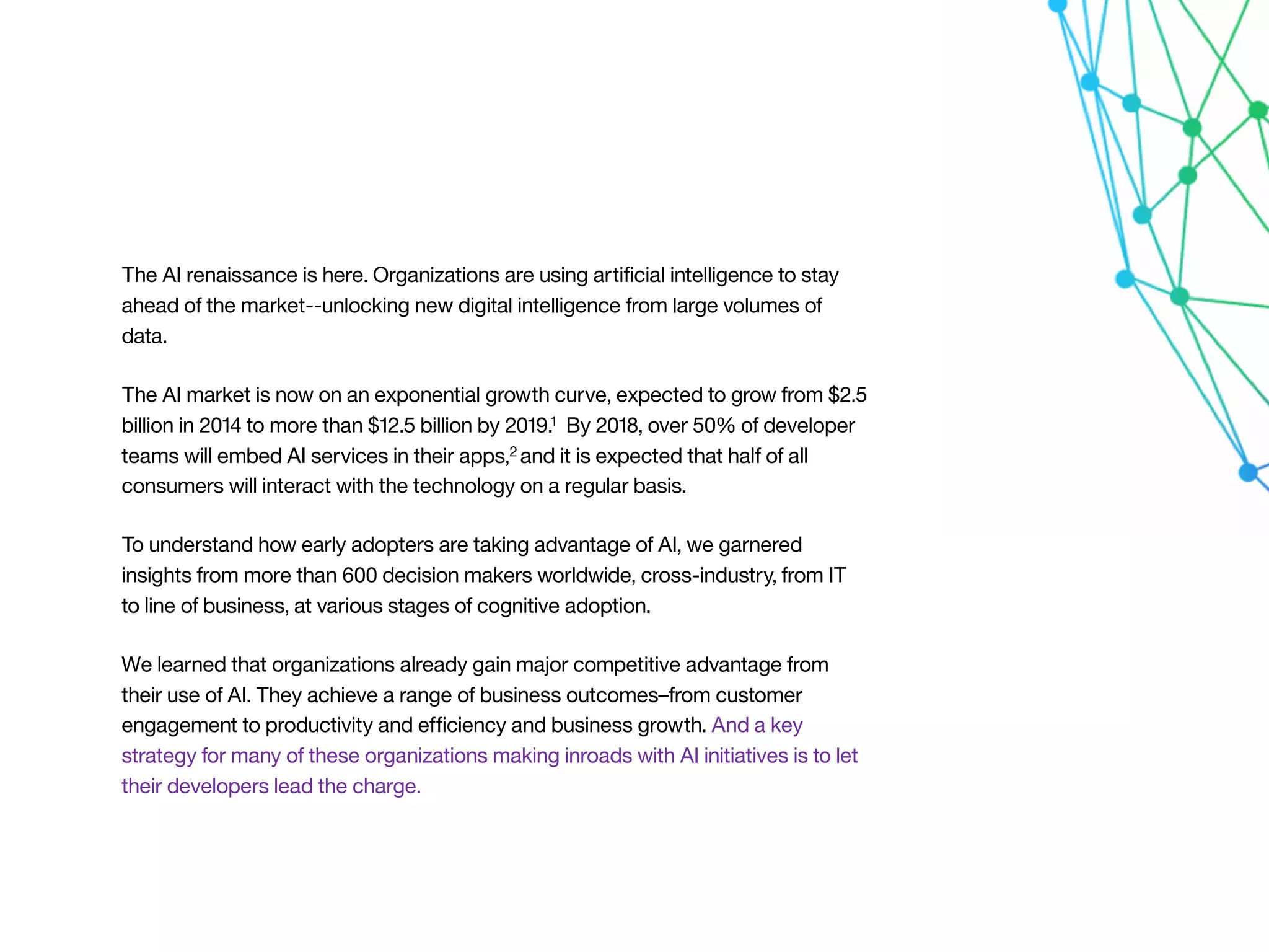 The AI market is experiencing exponential growth, projected to increase from $2.5 billion in 2014 to over $12.5 billion by 2019, with over 50% of developer teams expected to integrate AI services by 2018. Developers play a crucial role in leading AI initiatives within organizations, contributing to competitive advantages through improved customer engagement and productivity. Key challenges include technology costs and security concerns, while cloud-based services and open source technology are favored for AI capabilities.