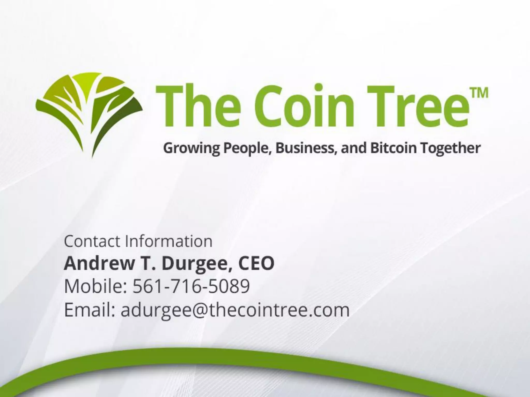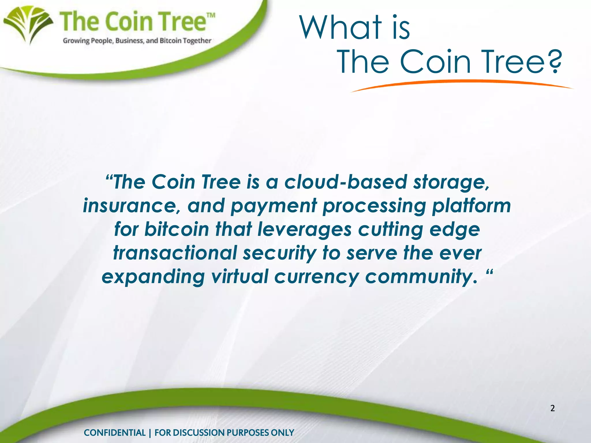 The Coin Tree is a cloud-based platform designed for bitcoin that provides secure storage, insurance, and payment processing aimed at the growing virtual currency community. Bitcoin, a decentralized digital currency, offers a new payment system that avoids central authority control, with a maximum supply of 21 million coins. The Coin Tree addresses major adoption challenges by providing a user-friendly platform, vault-style security, and insured storage solutions to facilitate bitcoin transactions for individuals and merchants.