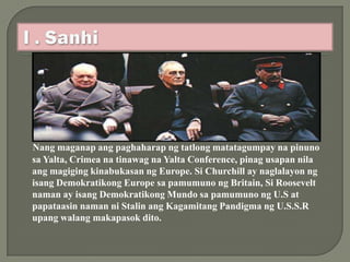 Ang Cold War (1947-1991) ay nag-ugat mula sa tensiyon sa pagitan ng Estados Unidos at Unyong Sobyet habang pinag-uusapan ang hinaharap ng Europa matapos ang WWII. Naglalaman ito ng mga mahahalagang kaganapan tulad ng Berlin Airlift, Korean War, at Cuban Missile Crisis, na nagpatatag ng mga alyansa tulad ng NATO at Warsaw Pact. Ang mga pagbabago sa pamumuno ni Mikhail Gorbachev sa huli ng Cold War ay humantong sa pagbagsak ng Soviet Union at pagkakaroon ng kalayaan ng mga bansa sa Europa.