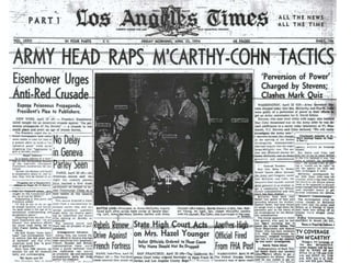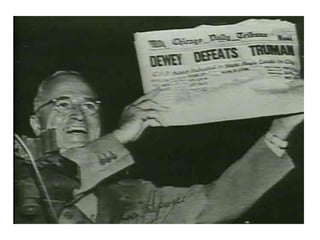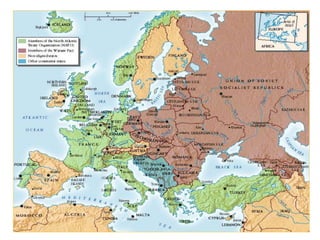 The Cold War was a decades-long ideological and geopolitical struggle between the United States and the Soviet Union that began following World War II. Key events that deepened tensions included Stalin reneging on allowing free elections in Eastern Europe, the Berlin Blockade, McCarthyism in the US, and the space race highlighted by the launch of Sputnik. Major crises like the Cuban Missile Crisis brought the two superpowers to the brink of nuclear war. Throughout the Cold War both sides sought to spread their influence and contain the other through military alliances like NATO and the Warsaw Pact as well as policies like containment and détente.
