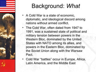 The Cold War (1947-1991) was marked by political and military tensions between the U.S. and the USSR, characterized by ideological discord without direct conflict. Key events included the Korean War, Cuban Missile Crisis, and Vietnam War, alongside strategies such as proxy wars, brinkmanship, and détente. The era ended with the collapse of the Soviet Union, driven by mutual distrust, competition for global influence, and internal reforms.