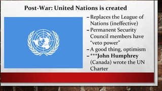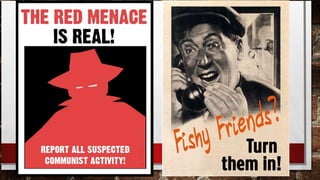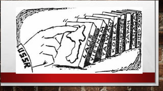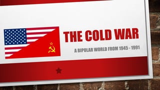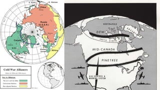 The Cold War was a period of geopolitical tension between the United States and Soviet Union from 1945-1991. The two superpowers competed for global influence through military alliances like NATO and the Warsaw Pact, nuclear and space races, and proxy wars in developing nations. Canada played a role in early warning systems through NORAD and developed its own advanced fighter jets, though its programs were eventually influenced by the US. Both sides lived under the threat of nuclear war through the principle of mutually assured destruction.
