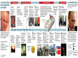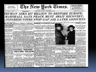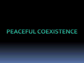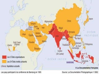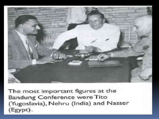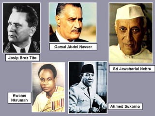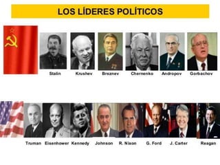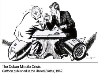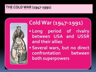 The Cold War was a period of geopolitical tension between the United States and Soviet Union from 1947 to 1991. It involved periods of rivalry, conflicts through proxy wars, and efforts at diplomacy. Key events included the division of Germany and Berlin after WWII, the Korean War, Vietnam War, Cuban Missile Crisis, and decolonization movements supported by both superpowers to weaken European colonial powers. While never directly fighting each other, the US and USSR engaged in an arms race, ideological battles, and conflicts by backing opposing sides in regional wars throughout the world.
