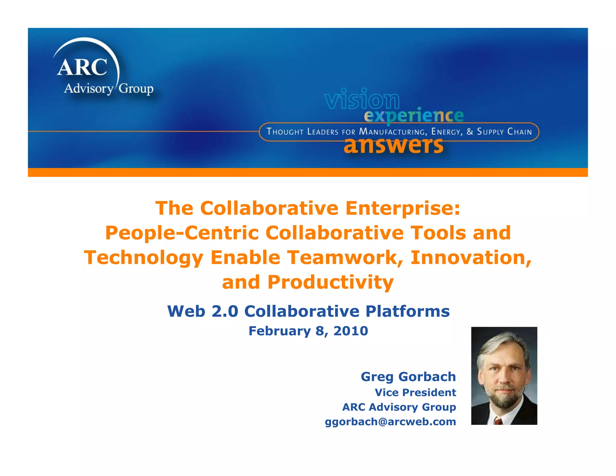 The document discusses the importance of people-centric collaborative tools and technologies in enhancing teamwork, innovation, and productivity, particularly in the context of Web 2.0 platforms. It highlights the evolving nature of enterprise technology platforms that support collaboration requirements and the necessary shift in manufacturing practices to integrate these technologies effectively. Additionally, it emphasizes that improved collaboration can lead to accelerated innovation and improved business strategies.