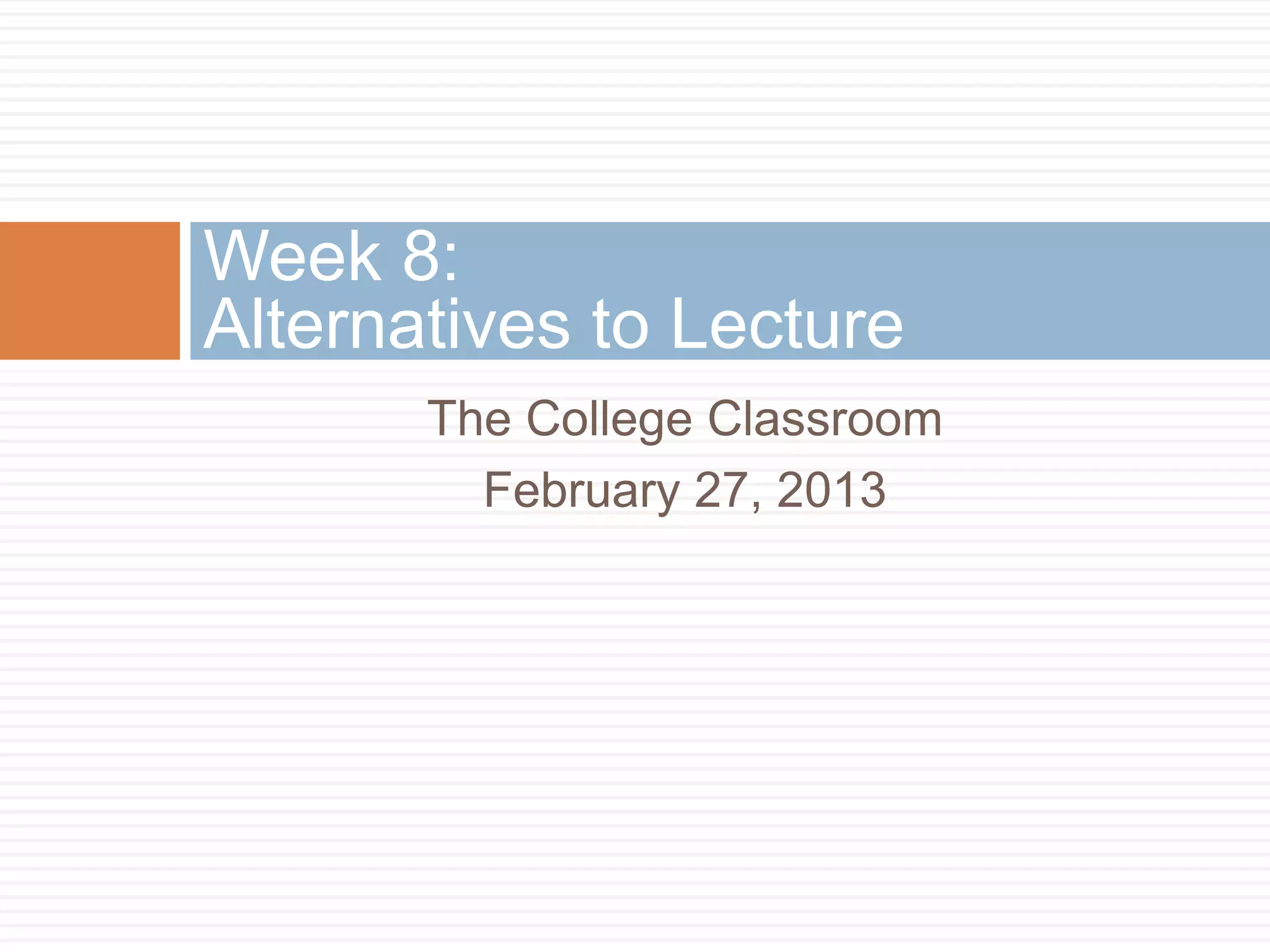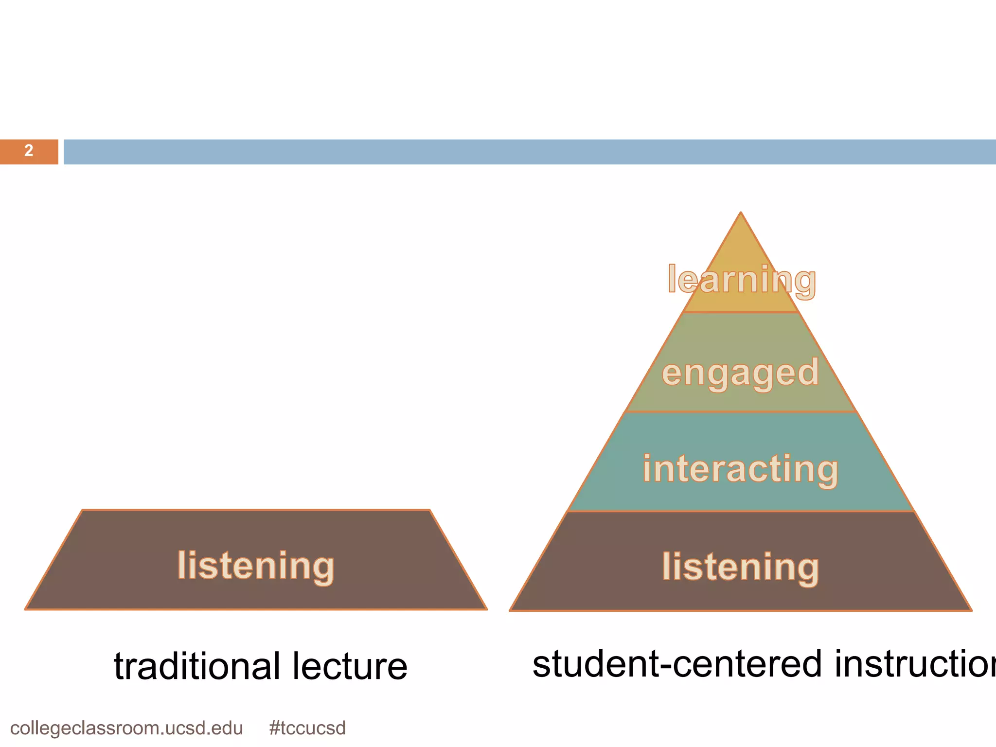 This document discusses alternatives to traditional lecture-based college instruction. It provides several key findings from research on how people learn: 1) Students come to class with preexisting understandings that must be engaged; 2) To develop expertise, students must have in-depth knowledge within a conceptual framework and be able to apply and retrieve their knowledge; 3) Students must learn metacognition, or thinking about their own thinking. The document advocates for student-centered instruction using techniques like interactive videos, demonstrations, worksheets, and clicker questions to actively engage students in class.