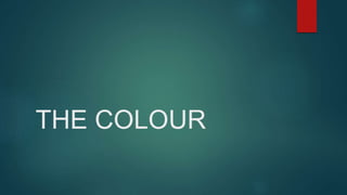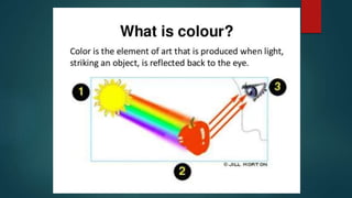 The document discusses the key properties and types of color, including hue, saturation, and value. It defines primary colors as yellow, cyan, and magenta, secondary colors as green, violet and orange, and tertiary colors as mixtures of primary and secondary colors. The document also covers complementary colors that are opposite each other on the color wheel, analogous colors that are next to each other, and how to create harmony using warm/cold colors, analogous/complementary colors, and through value and saturation contrast.