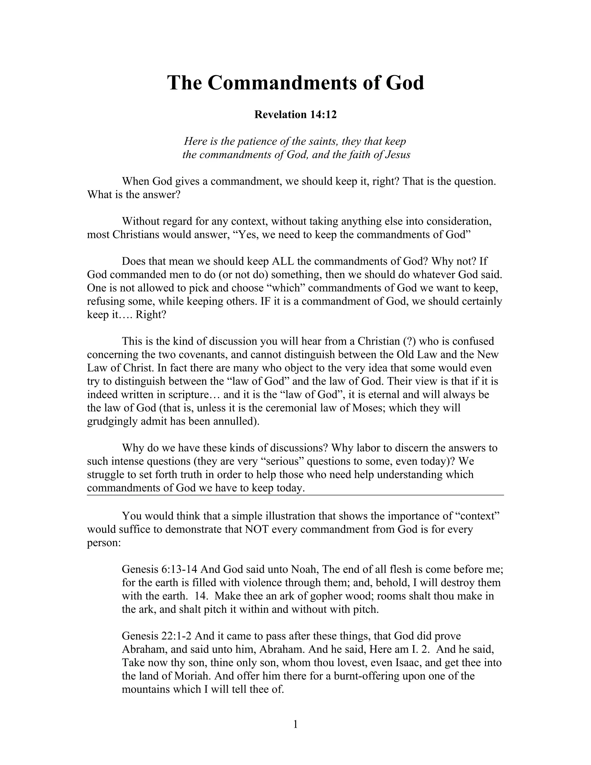 The document discusses whether Christians are obligated to keep all the commandments of God mentioned in the Bible. It notes there is confusion among some believers who cannot distinguish between the Old and New Laws. The document examines how this issue affected the early church and was resolved in Acts 15, where it was determined Gentile Christians did not need to follow the Law of Moses or be circumcised. It argues context is key to determining which commandments still apply today. The document also discusses whether Christians must keep the Sabbath or Ten Commandments.