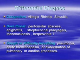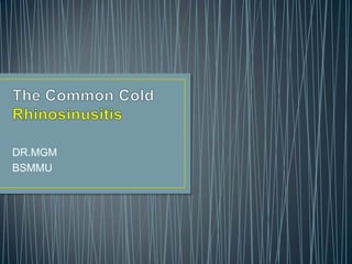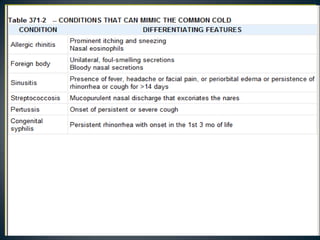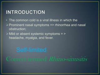 The common cold is caused by a viral infection that results in prominent nasal symptoms like rhinorrhea and congestion along with mild systemic symptoms. It is self-limited, usually lasting 1 week. Children experience 6-8 colds per year on average. Symptomatic treatment includes nasal decongestants, analgesics, and increasing fluid intake. Antibiotics are ineffective as colds are viral in nature. Complications can include sinusitis, otitis media, or asthma exacerbations.