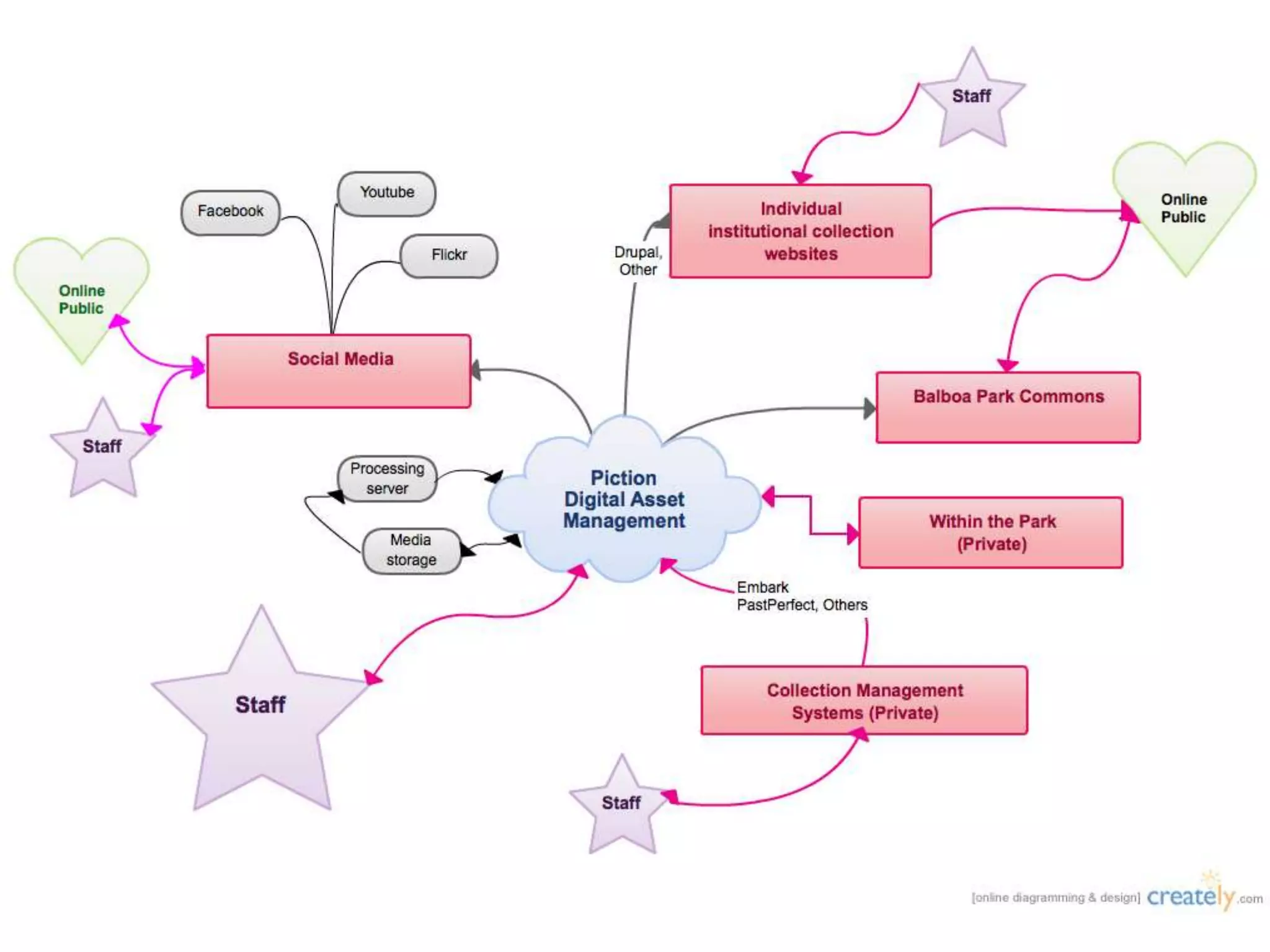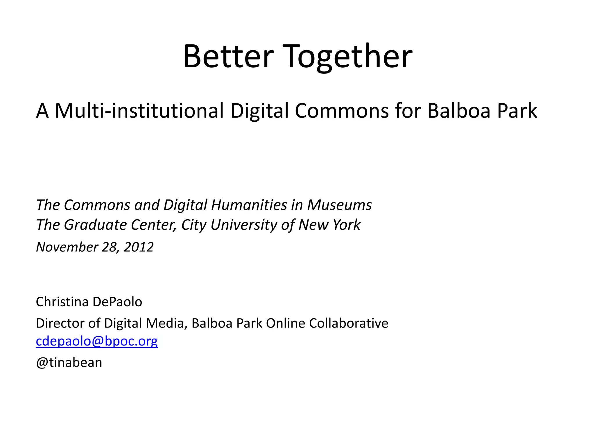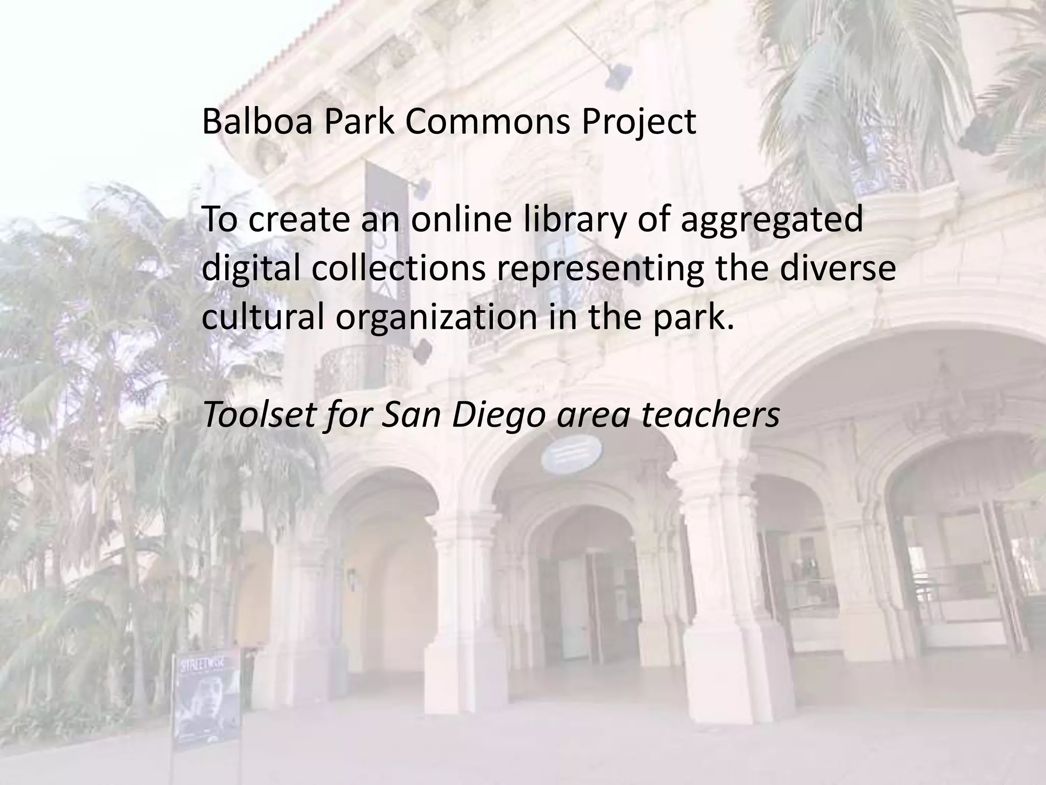 This document discusses plans to create an online digital commons for cultural organizations in Balboa Park, San Diego. It will aggregate digitized collections from various museums and institutions in the park to make them more accessible. The Balboa Park Online Collaborative has already digitized over 250,000 items. Their goals are to establish common collection management systems, data standards, and a digital asset management system to bring the collections together in one portal for students, teachers and the public to discover. Challenges include integrating data from different databases and platforms while maintaining metadata quality.