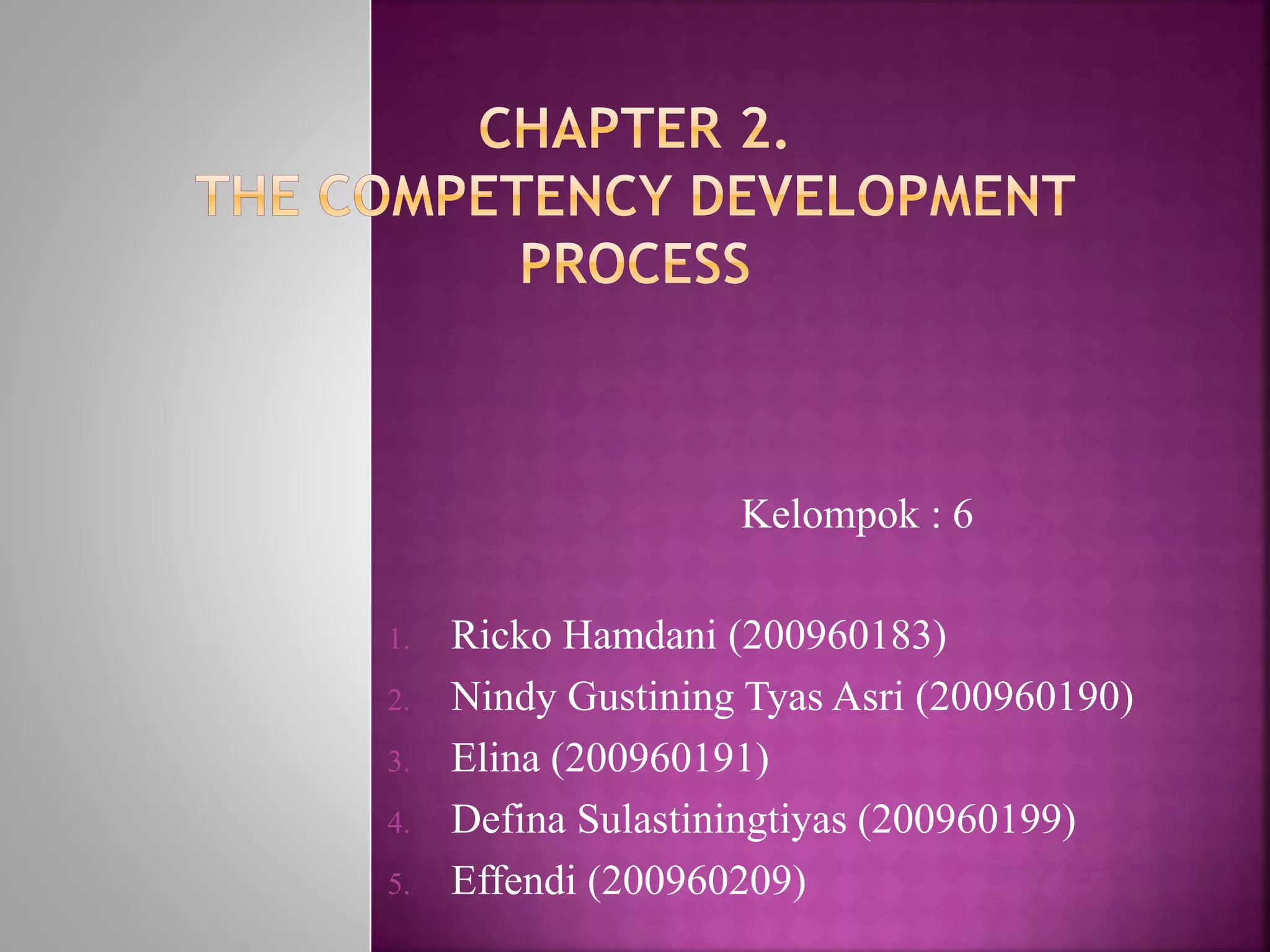 This document outlines a 3-stage process for competency development of a group consisting of 5 members. Stage 1 involves data gathering and preparation like studying identified jobs, identifying skills, and probable competencies. Stage 2 is data analysis where competencies are reviewed, defined, and assigned proficiency levels. Stage 3 is validation that includes validating content and refining competency definitions if needed. The process impacts interpersonal, personal, and team competencies.