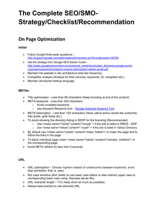 The document provides a comprehensive checklist and recommendations for on-page and off-page search engine optimization (SEO) and social media marketing. It includes over 100 specific recommendations across categories like on-page optimization of titles, meta tags, URLs, content; increasing website speed; blogging; avoiding spam; building authority; testing; off-page link building; and using social media and tools. The goal is to optimize all aspects of a website and online presence to improve search engine rankings and visibility.