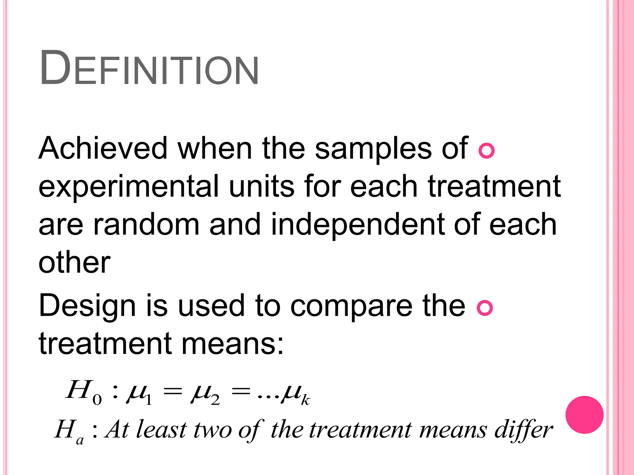 The document introduces the Completely Randomized Design (CRD) for analyzing variance (ANOVA), emphasizing the need for random and independent samples to compare treatment means. It outlines the steps for conducting an ANOVA, including checking assumptions like normality and variance, and details on calculating test statistics and critical differences. Additionally, it highlights multiple comparison methods to determine which treatment means differ significantly based on example data from a manufacturer testing different coating types.