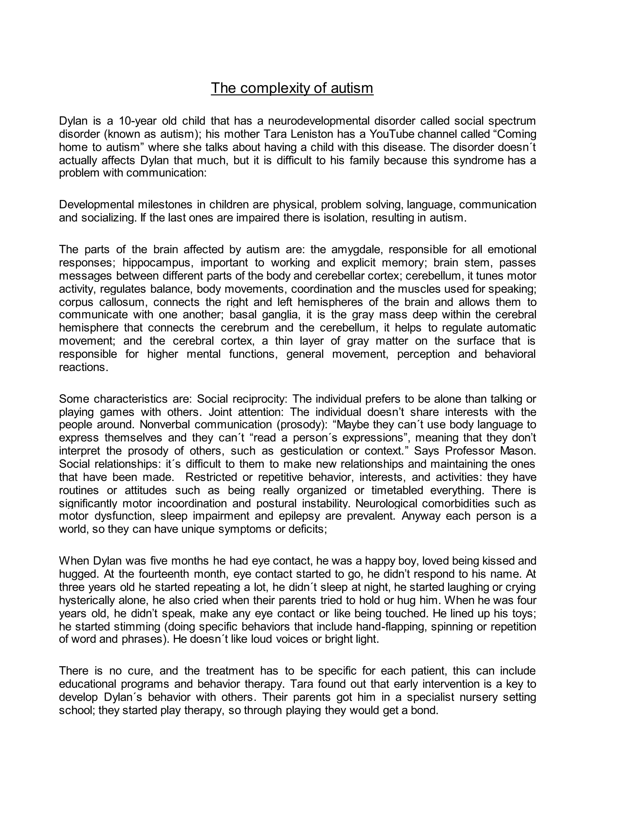 Dylan is a 10-year old boy with autism spectrum disorder who has difficulty with social communication and interaction. Autism affects various parts of the brain responsible for emotional responses, memory, movement coordination, and higher mental functions. Characteristics of autism include difficulties with social reciprocity, joint attention, nonverbal communication, and restrictive or repetitive behaviors. While there is no cure for autism, early intervention and behavioral therapy can help develop skills. The causes of autism are still unclear but are thought to involve genetic and environmental factors that disrupt brain development.