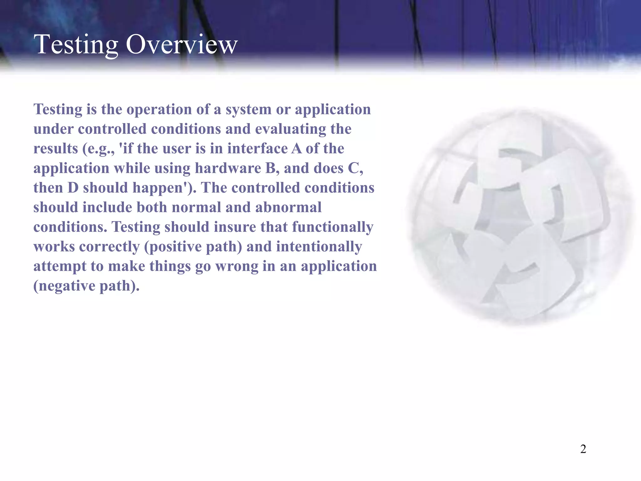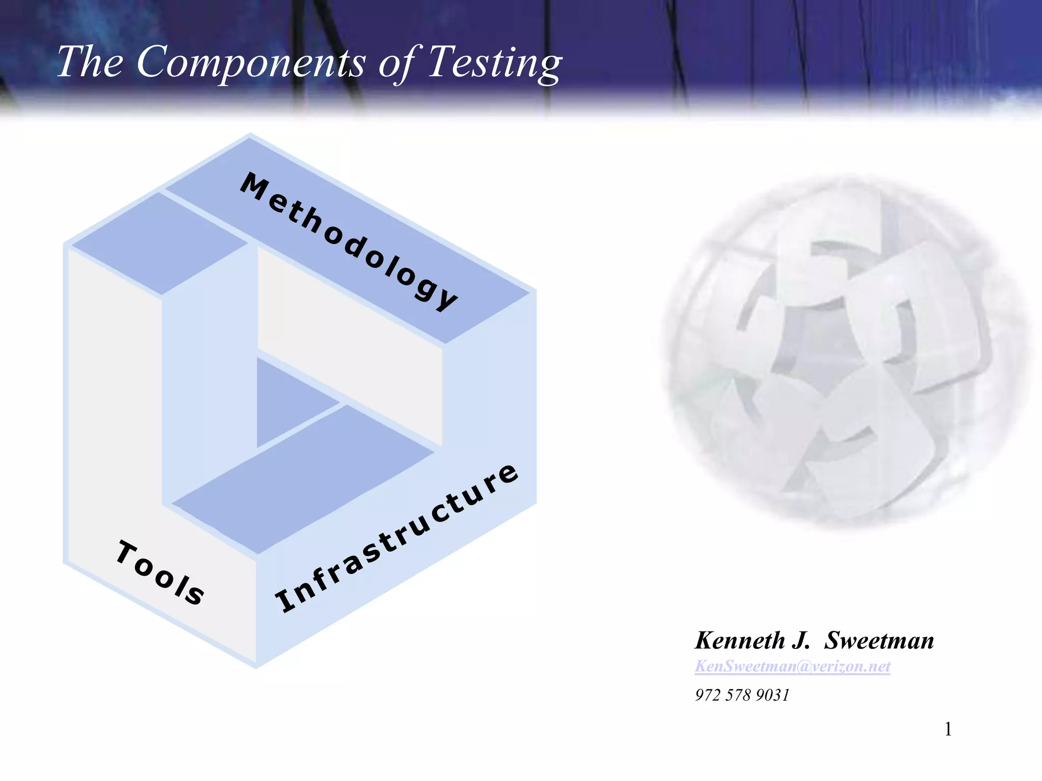 The document discusses the key components and concepts of software testing. It covers people, processes, infrastructure, testing methodologies, test planning and execution, defect tracking, metrics, and more. The core elements of testing include testing strategies, requirements tracing, test case development, test environment setup, test execution, and results reporting. Different types of testing are also outlined such as unit testing, integration testing, functionality testing, and volume testing.
