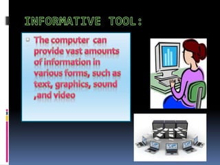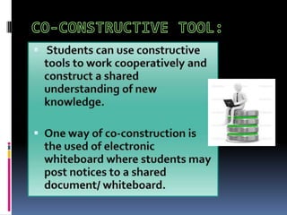This document summarizes key perspectives on constructivism and social constructivism as frameworks for understanding learning. Constructivism views knowledge as constructed individually, while social constructivism sees it as constructed within a social context. Theorists discussed include Piaget, Bruner, Vygotsky, and Dewey. The document also outlines how computers can serve as information tools, communication tools, constructive tools, co-constructive tools, and situating tools to support learning from a social constructivist perspective.