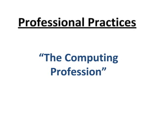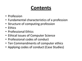 The document outlines the characteristics and structure of the computing profession, emphasizing the importance of formal and informal education, accountability, and ethical conduct. It details the ethical issues in computer science, the need for professional codes of conduct, and the principles guiding professional ethics. Additionally, it provides guidelines such as the ten commandments of computer ethics and discusses real-life applications of these ethical codes in software engineering.