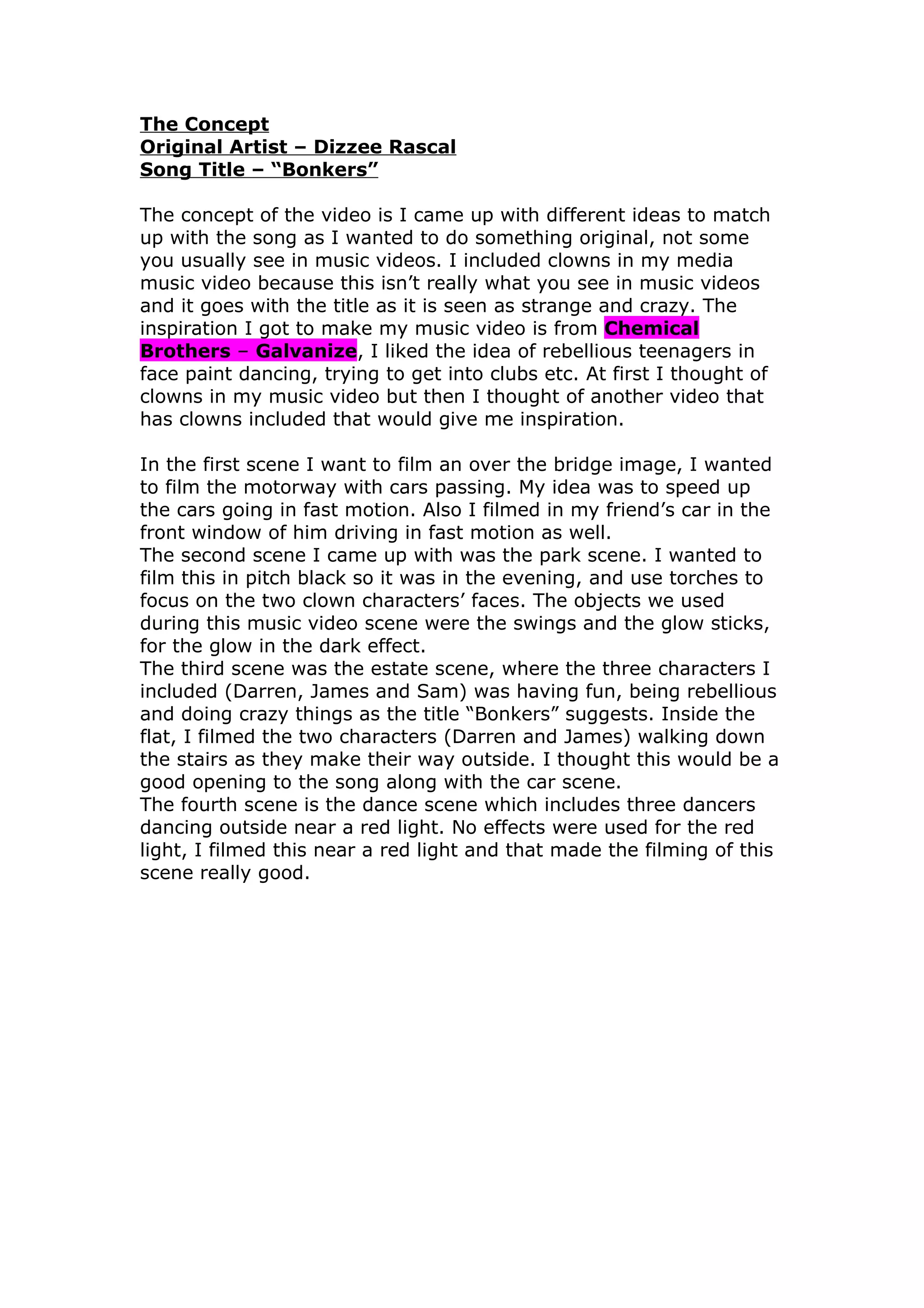The document describes the concept and scenes for the music video for Dizzee Rascal's song "Bonkers". The concept was to include clowns to make the video unique from typical music videos and match the strange title. There were four scenes planned: 1) A fast-motion car driving over a bridge. 2) Two clown characters in a dark park lit with torches and glow sticks. 3) Three characters having fun and doing crazy things on an estate as suggested by the song title. 4) Three dancers dancing near a red light with no effects used.