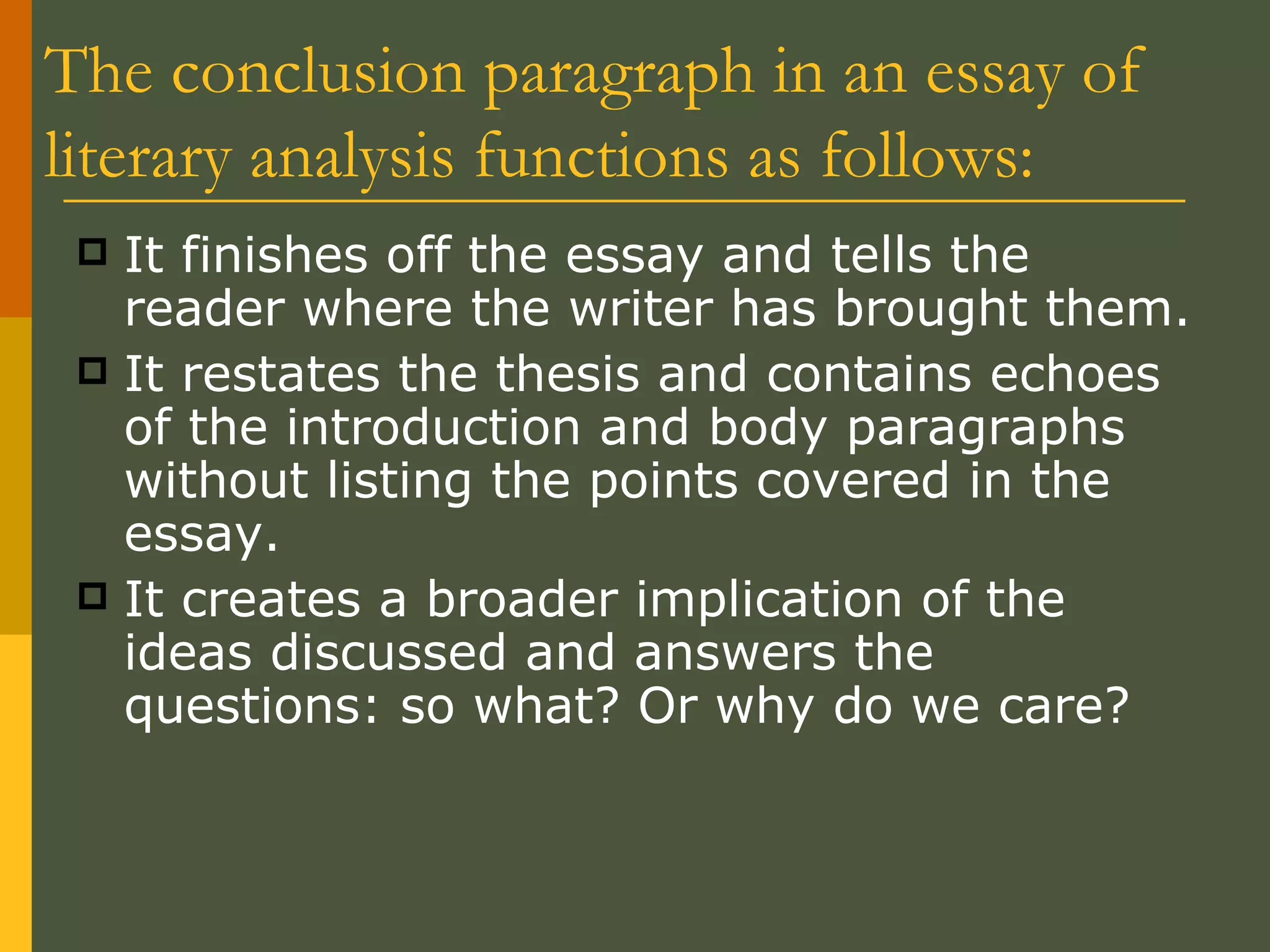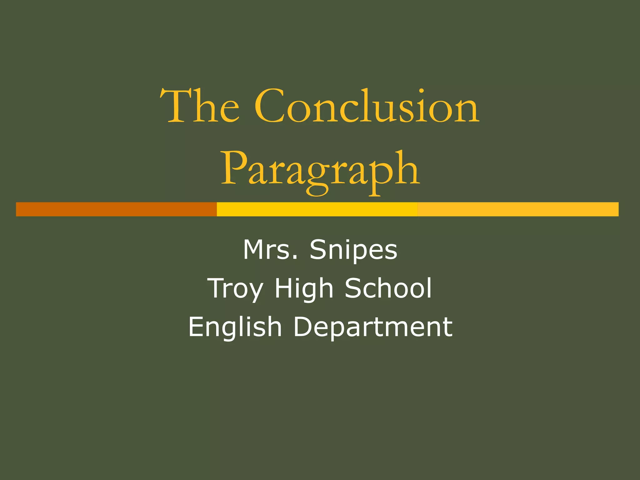 The document provides guidance on writing an effective conclusion paragraph for an essay. It explains that the conclusion should restate the thesis in a new way and widen the discussion to broader implications. It also discusses strategies for composing conclusions, such as striking a hopeful or meaningful tone, and evaluates sample conclusion paragraphs based on how well they follow the guidelines.