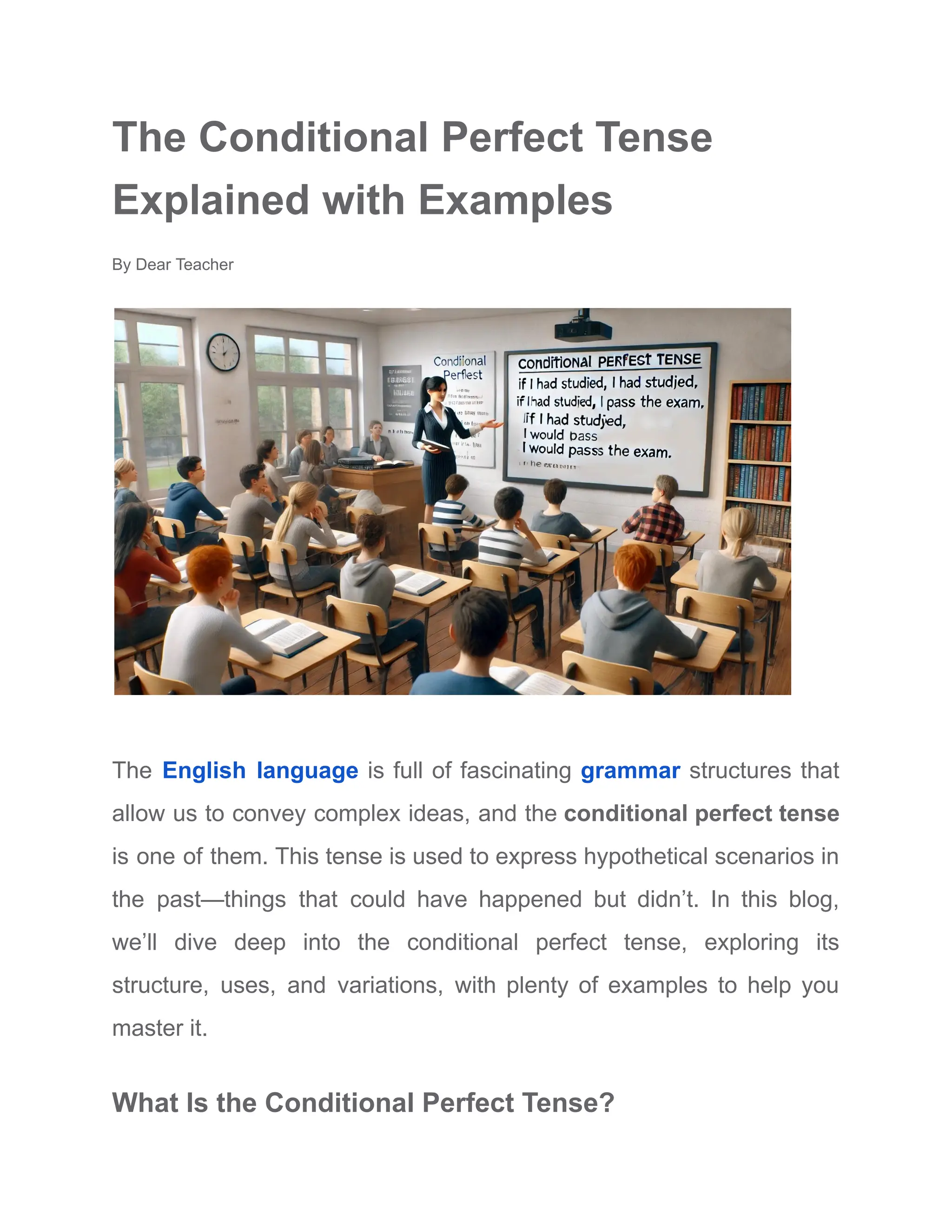 The document explains the conditional perfect tense, used to describe hypothetical situations in the past that did not occur. It details its structure, uses, and examples, emphasizing the role of modal verbs such as would, could, and should. Additionally, it highlights common misconceptions and practical applications in everyday conversation.