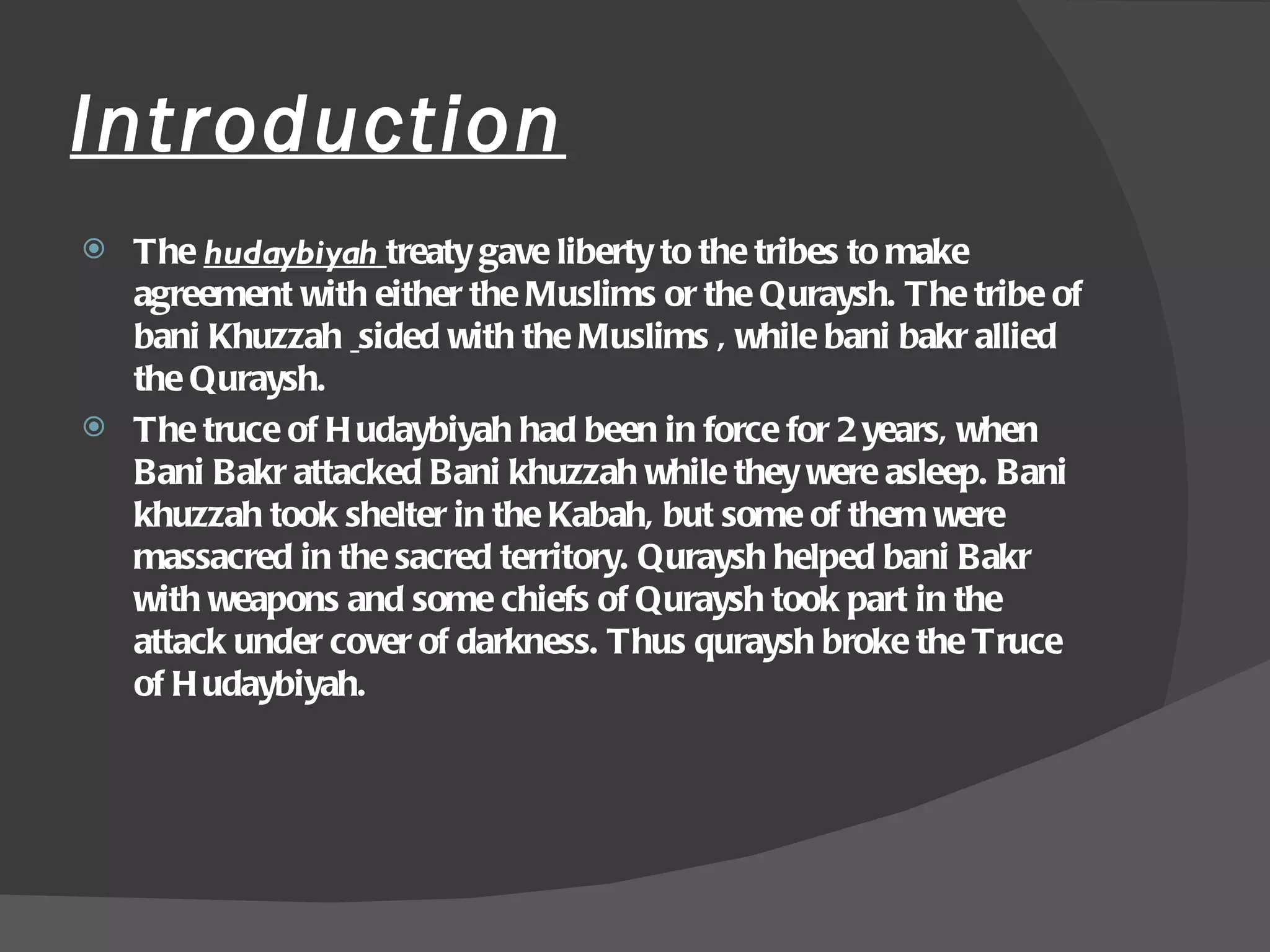 The document recounts the events leading up to and during the Muslim conquest of Makkah in 630 CE, following the breaking of the Treaty of Hudaybiyah by the Quraysh. After an attack on the Banu Khuz'ah by their allies, the Banu Bakr, the Prophet Muhammad was prompted to prepare an expedition to reclaim Makkah, which he did successfully and with mercy, declaring safety for those who sought refuge. The document highlights themes of justice, humility, and the restoration of sacredness to the Ka'bah, as well as the mass conversion of the Quraysh to Islam following the conquest.